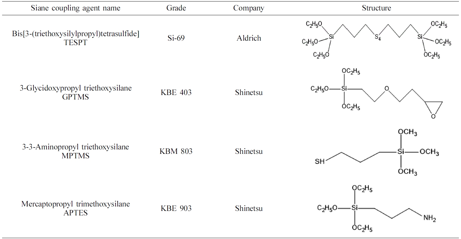 고무의 보강효과에 직접적으로 영향을 주는 인자는 고분자와 충전제 사이의 적정 충전량 및 고분자 매트릭스 내 분산성이다. 일정 충전량을 초과하거나, 분산성이 좋지 않을 경우 보강효과에 매우 큰 영향을 미친다. 또한 충전제의 성질로는 입자의 크기, 면적, 형태, 표면의 화학적 성질 등을 들 수 있다. 일반적으로 충전제의 비표면적이 크고 입자경이 작은 충전제가 고분자 매트릭스 내 균일하게 분산이 되어 최대의 보강효과를 얻을 수 있다. 그리고 충전제와 고무 매트릭스와의 계면 특성 또한 보강효과에 영향을 준다. 계면 특성이 개선되면 충전제와 고분자간 결합력이 증가되어 상호작용이 우수해진다. 그 결과 응력을 가할 시 분산이 잘 이루어져 기계적 특성이 우수해진다.4 실란 커플링제는 두 개의 서로 다른 반응기를 가진 실리콘(Si)에 기반한 화학물질로 한 쪽은 메톡시(methoxy)나 에톡시(ethoxy)와 같은 알콕시(alkoxy group)기와 다른 한 쪽은 고분자와 결합을 하는 유기 관능기로 이루어져 유기질 재료와 무기질 충전제간의 다리(bridge) 역할을 한다. 실란 커플링제의 알콕시기는 Rn-Si-(OR)3로 나타내며, OR은 가수분해반응으로 Rn-Si-(OH)3 구조를 형성하여 충전제 표면의 실라놀기와 탈수화 반응을 통해 공유결합을 형성한다. 또한 고무 매트릭스 내 충전제의 분산성을 향상시키며, 고무와 무기 충전제간의 상호작용을 증대시켜 기계적 특성을 향상시킨다.5-7 그리고 실란 커플링제는 분자 내 결합된 알콕시기의 수와 기능성기에 따라 다양한 종류가 있으며, 고무와의 결합 특성 및 가교 특성과 무기충전제와의 가수분해반응 정도에 큰 영향을 미친다.7