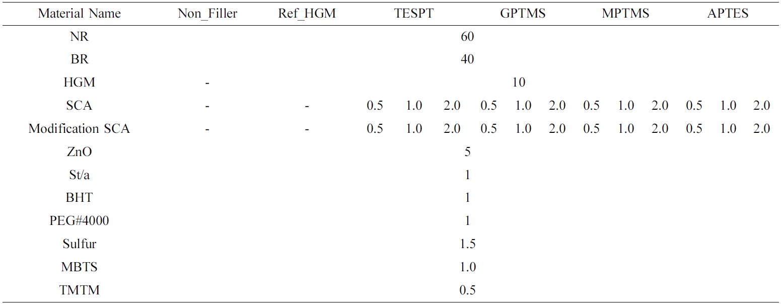 시약 및 재료. 실험에 사용된 HGM은 3M사의 iM16K (crush strength=16000 psi, True density=0.46 g/cc, Average diameter=20 μm), 실란 커플링제는 bis[3-(triethoxysilylpropyl) tetrasulfide] (TESPT, Aldrich), 3-glycidoxypropyl triethoxy-silane(GPTMS, Shinetsu), mercaptopropyl trimethoxysilane (MPTMS, Shinetsu), 3-3-aminopropyl triethoxysilane(APTES, Shinetsu). Table 1에 사용된 실란 커플링제의 화학구조식을 나타내었다. 용매는 디클로로메탄(dichloromethane, 99.5% absolute, Aldrich)을 정제 없이 사용하였다. 고무 배합에 사용한 천연고무(natural rubber, NR)는 SVR 3L(Phuoc Hoa Rubber, 베트남), 합성고무(butadiene rubber, BR)는 KBR 01 (금호 석유화학, 대한민국), 공동재료로 산화아연, 스테아린 산 및 황 등은 일반 고무용을 사용하였다.