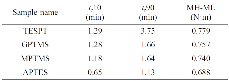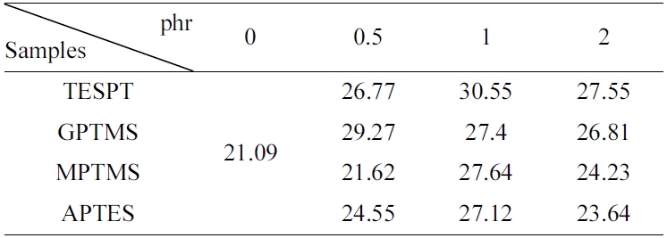 ODR(Oscillating Disk Rheometer) 측정 결과: 표면 개질된 HGM을 고무 복합체에 적용 시 가교 특성에 미치는 영향을 알아보기 위해 ODR을 측정하여 그 결과를 Table 3에 나타내었다. ML(moment lowest)은 가장 낮은 토크 값을 의미하고 MH(moment highest)는 가장 높은 토크 값을 의미한다. MH-ML(Δt)은 최대 토크에서 최소 토크를 뺀 값으로 고무의 가교 밀도 및 충전제와의 상호작용의 척도로 많이 이용되고 있다.14 그 중 TESPT가 가장 높은 MH-ML을 나타내었는데, 이는 TESPT 실란 커플링제 분자 내 테트라설파이드(tetrasulfide)가 열에 의해 모노설파이드(monosulfide) 및 디설파이드(disulfide)로 분해되어 1차 공유 결합을 형성하여 충전제와 고무 매트릭스간의 상호작용을 개선시킨 것으로 판단된다.8,15 GPTMS의 경우 분자 내 존재하는 에폭시기의 개환반응으로 더 많은 HGM과의 결합으로 분산성을 개선시켰으며,16 가황촉진제와 같은 극성 물질의 흡착을 방지하였기 때문에 가교 특성에 영향을 주어 MH-ML값이 높게 나온 것으로 판단된다.
