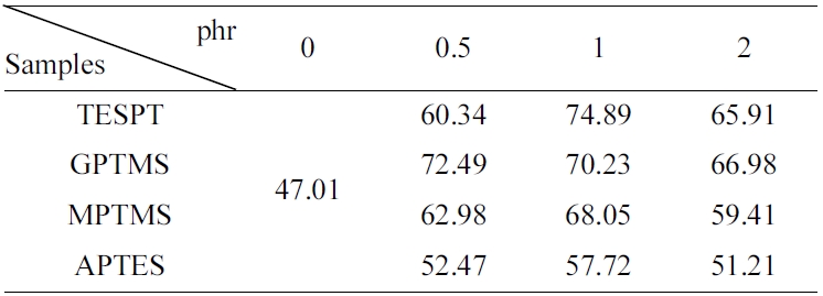 실란 커플링제의 종류와 상관없이 표면 개질된 HGM을 첨가한 고무 복합체의 인장강도와 인열강도 모두 증가하였다. 공통적인 이유로 첫 번째 표면 개질로 인해 HGM 표면에 존재하는 실라놀기간의 응집체 형성을 방지하여 고무 매트릭스 내 분산성을 증가시키고, 다른 극성분자의 흡착을 방지하였기 때문이다.17,18 HGM 표면의 실라놀기는 극성분자로 고무 복합체에 첨가되는 다른 극성분자들(ZnO, MBTS, TMTD 등)을 흡착하여 가교와 분산성에 영향을 주는데 이를 방지하였기 때문이다.6,7 두 번째 계면특성이 개선된 HGM과 고무 매트릭스간의 상호작용이 증가되었기 때문이다. 보통 충전제와 결합하고 있는 고무 분자에 응력이 가해질 때 그 응력은 충전제에 분산 또는 흡수되어 응력집중 현상을 완화시키며 보강효과가 나타난다. 이 경우 HGM의 계면 특성이 개선되어 고무와의 상용성이 증가되어 인장 시 응력을 다른 분자에 분산시켜 기계적 물성이 증가된 것으로 판단된다. 하지만, 실란 커플링제의 기능성기에 따라 인장강도와 인열강도에 차이가 있었다. 하지만, 모든 충전제의 경우 농도가 커질수록 기계적 물성이 감소하는 것을 보였다.