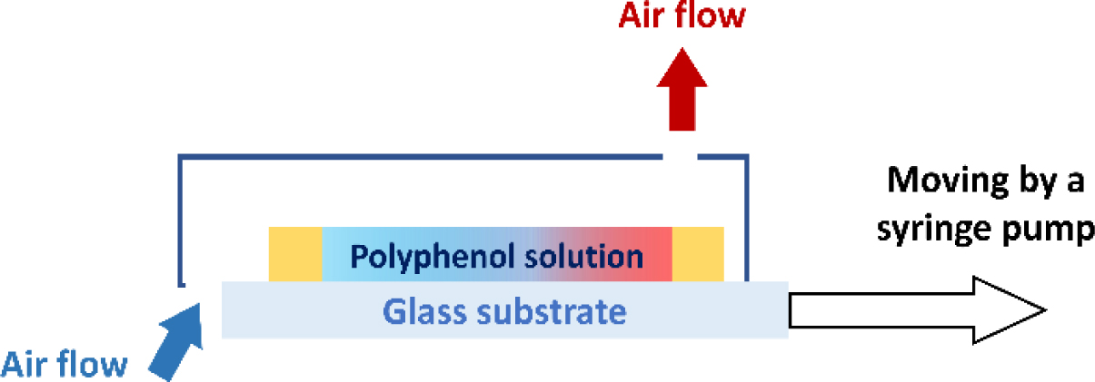제한된 공기흐름 시스템 내부에서의 증발결정화. 20 ℃로 유지된 cold stage와 75 ℃로 유지된 hot stage를 나란히 놓고 수평을 맞춘다. 위에서 준비된 유리 기판을 완전 건조한 후 세척한 실리콘 몰드를 붙인다. 실리콘 몰드를 붙인 면의 반대쪽 면에 써멀 그리스를 0.1 g 얇게 펴서 발라준다. 유리 기판과 hot stage의 공간을 채워 열전달을 원활하게 해준다. 이는 국소적이고 빠른 증발을 일으키기 위함이다. 준비된 기판을 hot stage에 폭 1 cm만큼 걸치게 놓아준다. Pre-heating을 70초 동안 해준다. 몰드에 순수 5 wt% luteolin 용액, luteolin과 ethyl cellulose 혼합 용액을 각각 캐스팅해준다. 신속하게 준비해 둔 슬릿 케이스의 슬릿이 hot stage 쪽의 용액 바로 위에 위치하도록 덮어준다. Figure 1과 같이, 시린지 펌프(syringe pump, KDS-100, KD Scientific, 미국)를 이용하여 슬릿 케이스를 덮은 용액 기판을 30 µm/s 속도로 끌어주며 증발시킨다.