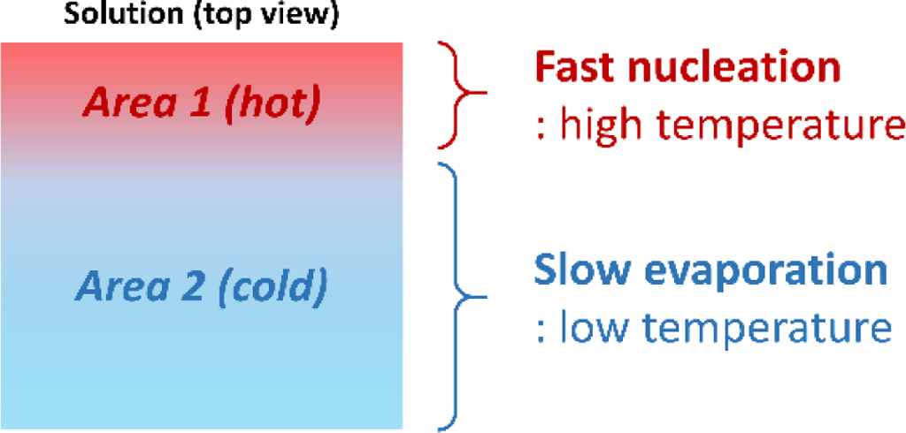 전체 용액은 80 ℃ hot stage 부분에 1 cm의 폭으로 걸쳐져 있다. Figure 2는 캐스팅된 용액을 위 쪽에서 바라봤을 때, 국지적으로 증발속도에 차이를 주는 주요 변수인 온도 구배를 모식도로 나타낸 것이다. 붉은색으로 표시된 Area 1의 상단에 슬릿이 위치해 있고 용액은 hot stage와 공기에 동시에 노출되어 있다. 따라서 이 부분의 용액 표면이 다른 부분에 비해 온도가 높기 때문에 빠른 속도로 용매가 증발하며, 농도가 높아진다. 이는 선택적, 국소적으로 빠른 결정 핵생성을 유도하는 역할을 하며, 슬릿이 없는 부분으로의 secondary nucleation이 일어나며 순차적인 균일한 결정 성장을 발생시킨다. 그리고 푸른색으로 표시된 Area 2는 아랫부분의 슬릿을 통해 공기가 유입될 수 있도록 되어 있고, cold stage 쪽에 놓였다. Area 1에서 상대적으로 고온에서 용매가 증발한 증기가 좁은 슬릿을 통해 천천히 빠져나가므로, Area 2에는 포화된 상태의 THF 증기로 차게 된다. 반대편 부분에서는 THF가 낮은 온도를 유지하게 되므로 과포화 상태에 도달하기까지 시간이 길다. 위와 같은 변수들에 의해 위치에 따른 증발속도에 차이를 주었다. 그리고 시린지 펌프를 통해 유리 기판을 일정속도로 끌어당기면 특정 부분부터 빠르게 증발시키고 연속적으로 바로 다음 증발을 유도하는 위의 모든 과정이 순차적으로 일어나게 된다. 따라서 증발속도의 차이와 연속적으로 온도구배에 의해 촉진되는 증발결정화에 의해 균일한 luteolin 결정이 재현성 있게 형성됨을 확인했다.
