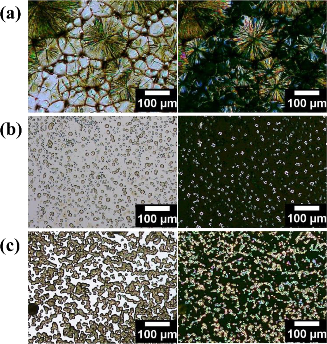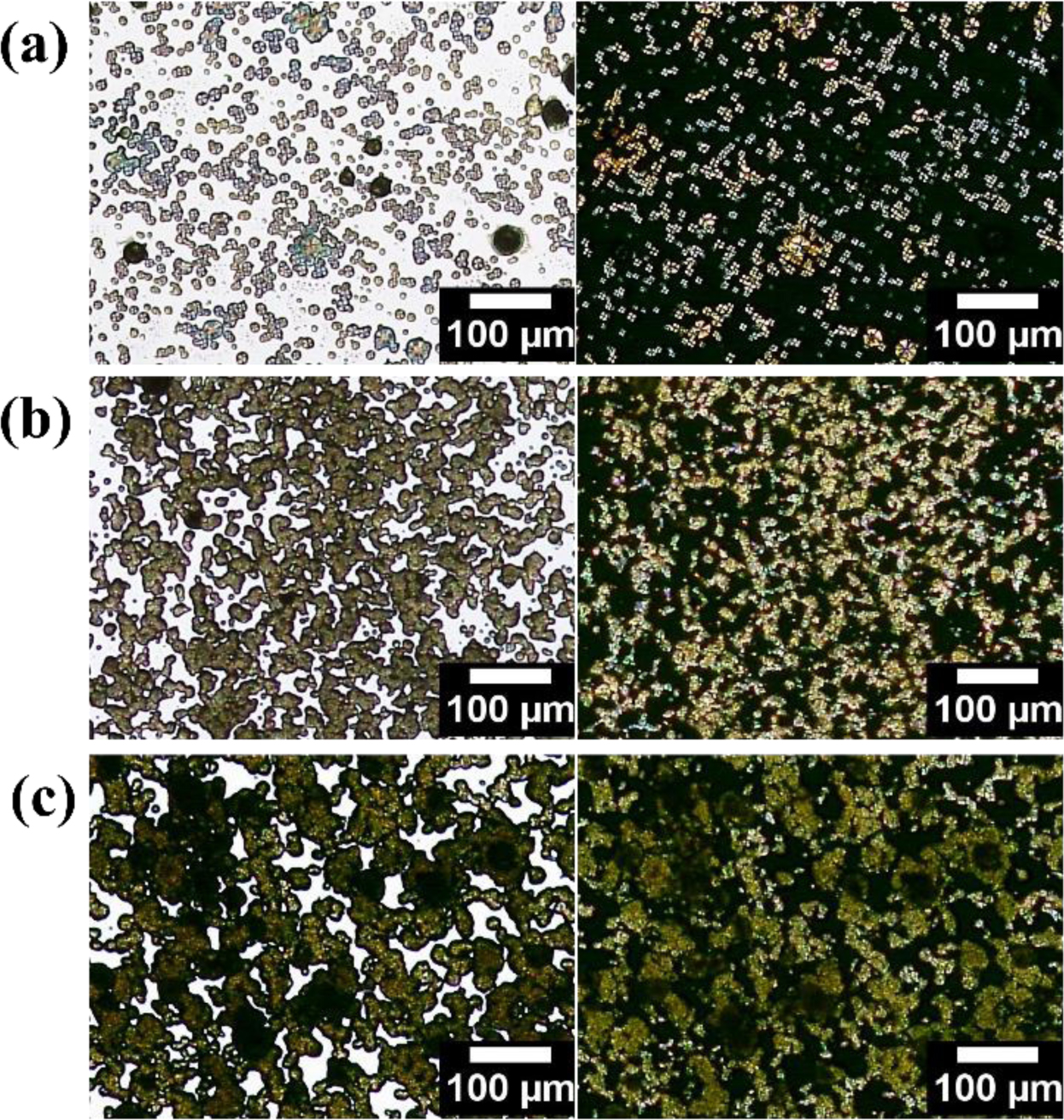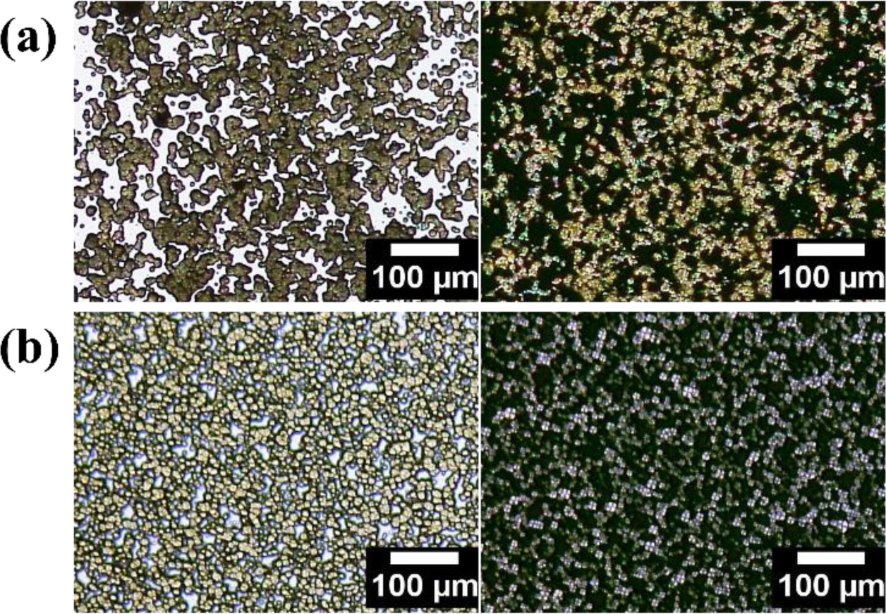 증발속도에 따른 결정 모폴로지 변화. Figure 3은 5 wt% luteolin 용액을 캐스팅한 유리 기판을 끌어주는 속도에 따른 결정의 모폴로지를 OM으로 관찰한 결과이다. 각각 증발 결정 샘플의 birefringence를 확인할 수 있는 편광 이미지가 오른쪽에 함께 제시되어 있다. 용액이 캐스팅된 기판을 끌어주는 속도는 증발하는 속도에 영향을 준다. 빠른 속도로 끌어줄수록 용액의 넓은 면이 hot stage와 접촉하게 되고, 이 면적에 비례하여 온도가 올라가게 된다. 즉, 용매가 증발하는 속도가 빨라지게 되고 용액의 해당 지점이 과포화상태에 빠르게 도달하게 된다. 결과적으로 핵생성이 많아지고 결정성장에 충분한 시간은 없게 되어 전체적으로 작은 결정이 형성될 것이다. 시린지 펌프를 통해 끌어당기는 속도를 각각 0(정지상태), 10, 30 µm/s로 설정하여 얻은 결과 중에서, Figure 3(a)의 경우 정지한 상태로 유리 기판의 1 cm만 hot stage에 접촉하여 증발이 일어난 경우이다. 다소 큰 granular 결정들을 관찰할 수 있고, 이는 예상한 메커니즘과 일치하는 결과이다. 그리고 10과 30 µm/s로 기판의 속도를 조절하였을 때는 훨씬 작은 spherulite의 원형 결정들이 생성되었다. Figure 3(c)가 Figure 3(b)보다 높은 밀도의 결정이 생성된 것을 확인할 수 있다. 10 µm/s로 끌어당긴 경우에는 핵생성이 낮은 빈도로 일어난 상태에서 계속 hot stage로 이동하다가 용액 전반적으로 과포화상태에 도달하여 한꺼번에 석출되어 버리는 현상이 나타났다. 반면에, 30 µm/s로 끌어당긴 샘플은 빠른 속도로 hot stage로 이동하여, 높은 빈도의 핵생성이 일어나고 결정이 성장하는 과정이 연속되어 용질들이 균일하게 증발에 의해 결정화되었다. 이는 기판이 이동하는 속도와 5 wt%의 luteolin 용액이 과포화에 도달하는 속도가 거의 유사해야만 균일한 빈도의 결정을 얻을 수 있을 것으로 사료된다. 이들 원형의 결정들은 그 내부에 더 작은 crystallite들이 존재할 것으로 판단된다.