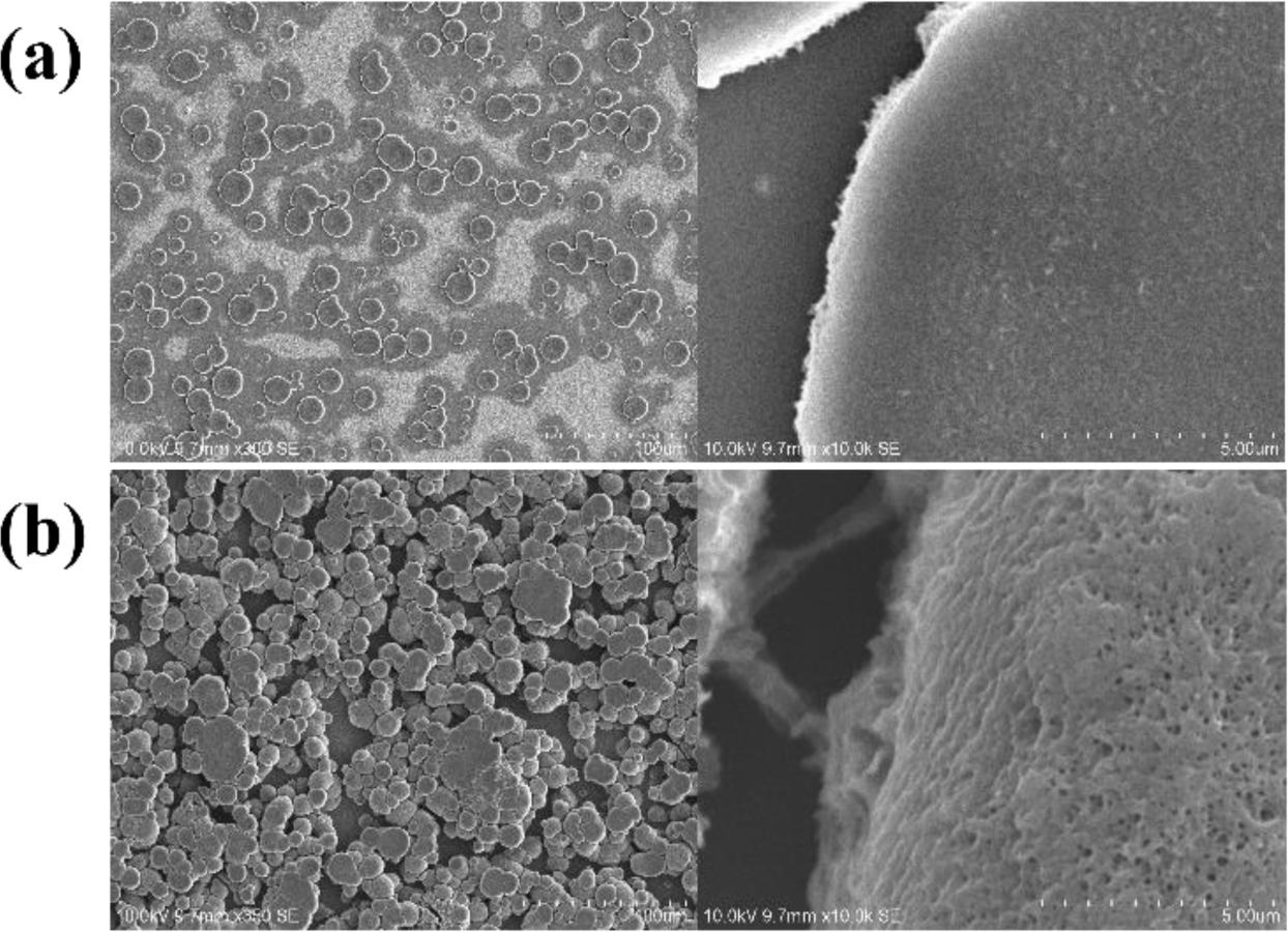 Figures 5와 6에서 그 차이점을 확인할 수 있는데, 각각 OM, SEM으로 얻은 이미지 데이터이다. Figure 5(a)에서 5(b)로의 변화를 보게 되면 spherulite한 원형 결정이긴 하나, 편광사진의 경우 좀 더 투명도가 낮아졌고, 경계면이 확실한 모폴로지로 바뀌었다. 이를 고배율의 SEM 사진으로 확인해보면 luteolin 샘플의 경우 유리 기판에 납작하게 붙어있고, 표면이 약간 거친 형태의 모습이다. 그러나 ethyl cellulose를 사용하면 Figure 6(b)의 모습처럼 수많은 원형의 작은 덩어리들이 구형의 결정 하나하나를 이루고 있으며, 이들이 다수가 응집된 모습을 볼 수 있었다. 그리고 표면의 모습도 다소 기공이 형성된 porous한 모습을 보여 고분자의 영향을 확인할 수 있었다. 이러한 결과들은 고분자 사슬들이 핵성생 이후에 작은 결정들의 응집에 관여하고 표면에 기공 형성에도 관여했음을 추측해 볼 수 있다.