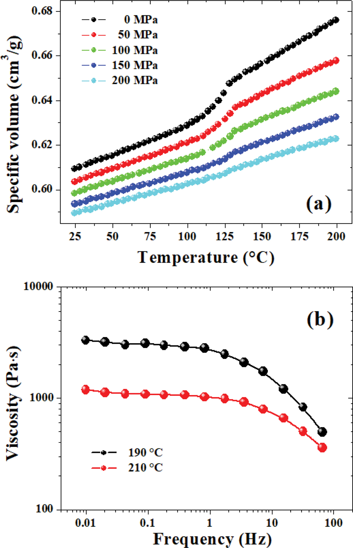 Figure 1 P-V-T relationship (a); viscosity curves measured at 190 ℃ and 210 ℃ (b) for neat PLA. |