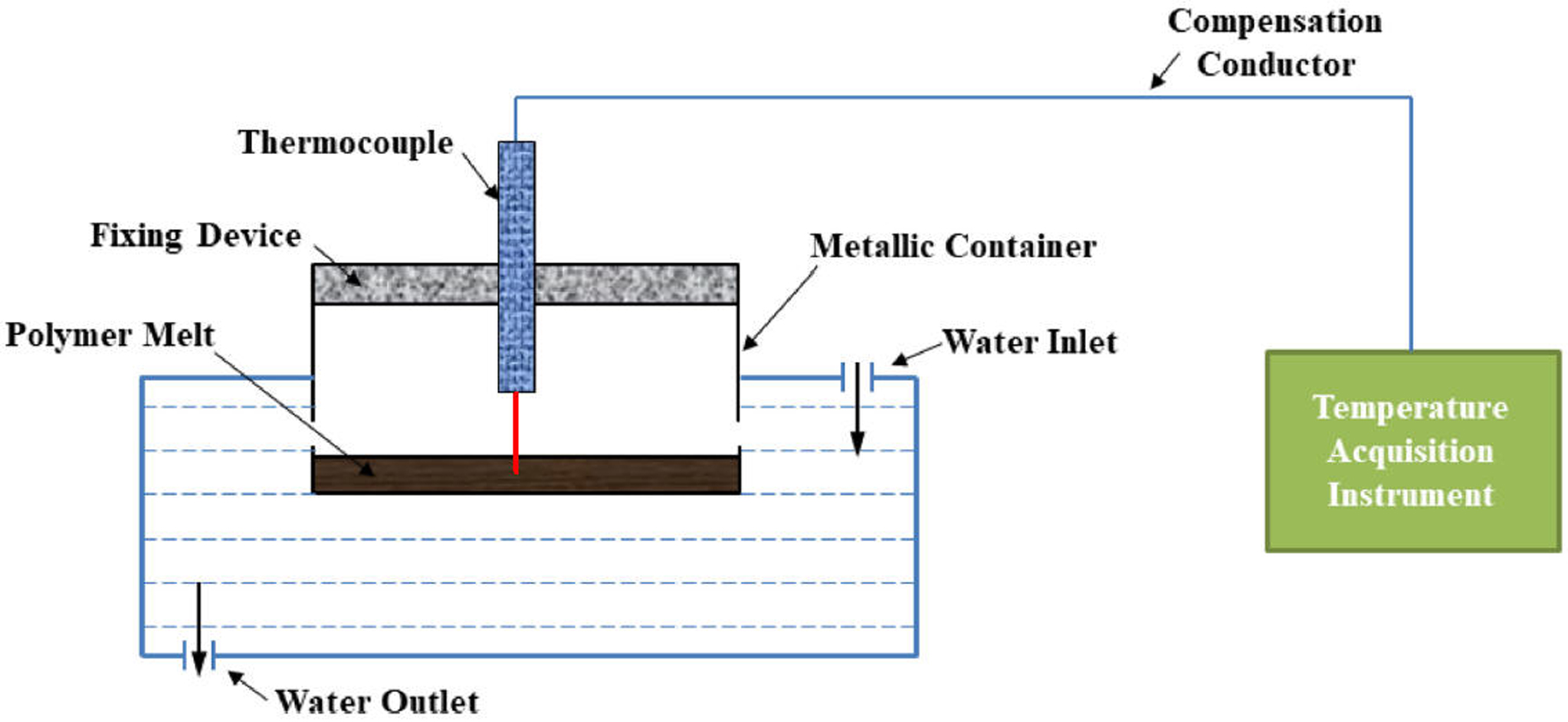 In Situ Measurement of Solidification Behavior: In this study, a micro-thermocouple (model: WRTK-192, Ode Precision Instrument Co., China) was used to record the temperature decay during the cooling process of the prepared samples. The micro-thermocouple was fixed on top of a specially-designed metallic container with its tip inserted into the molten samples at specific depth. The samples were initially heated to 250 ℃ by a hot-stage (model: 946A, Youyue Seiko Co., China), then the metallic container was quickly immersed into the cold water to cool the samples to the room temperature. The temperature decays during the entire cooling period was recorded by a data acquisition system (model: LU-R2100, Anthone Electronics Co., China) with a sampling time of 1.0 s. The experimental set-up used in this work is designed by our lab,28 and can be illustrated in Figure 2.