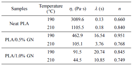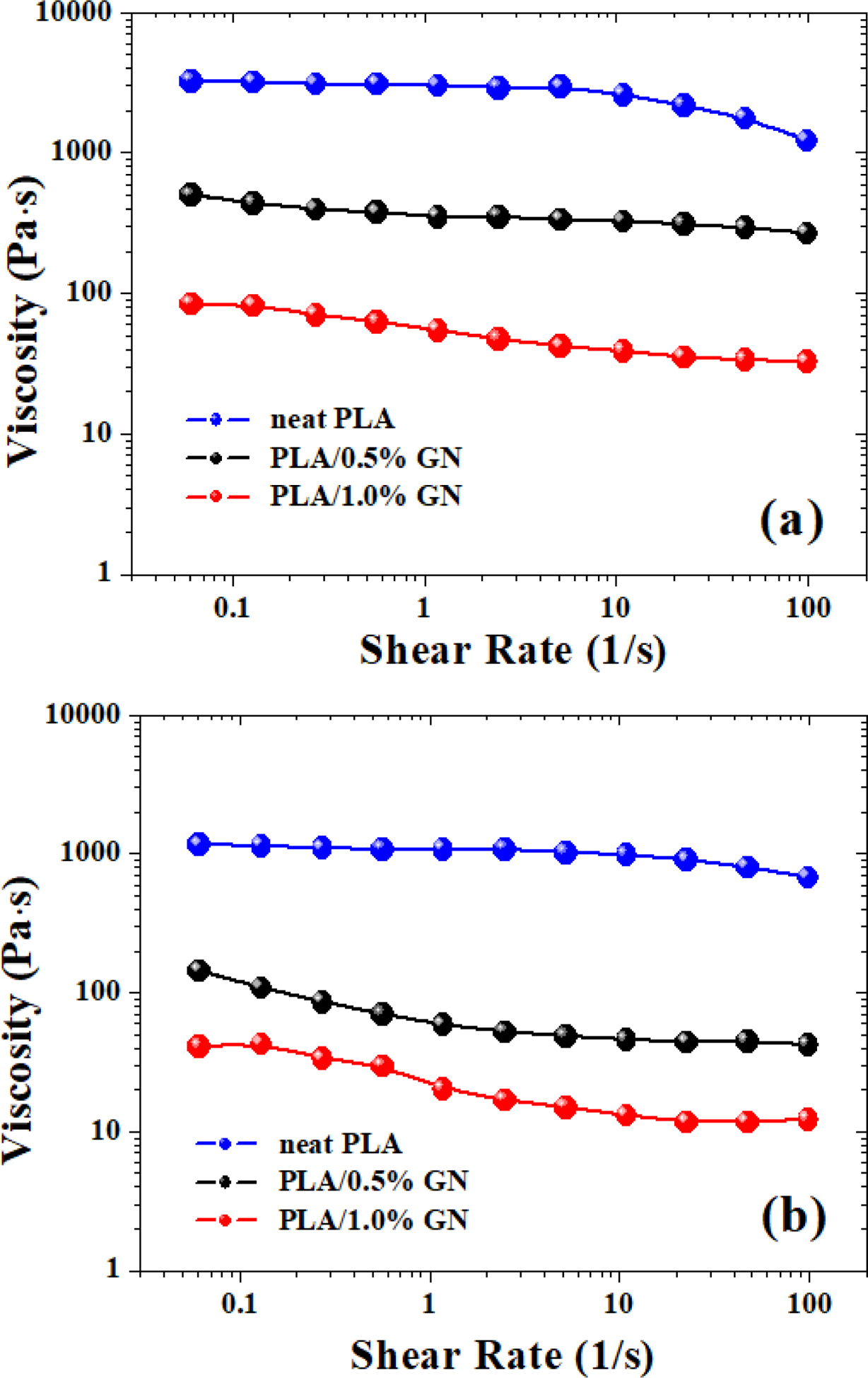Figure 3 showed the plots of viscosity vs. shear rate for PLA and PLA/GN composites at 190 and 210 ℃ through dynamic rheological tests. As can be seen from Figure 3, the viscosity of the PLA/GN composites were a bit lower than neat PLA, and with the increase of the GN content, the viscosity of the PLA/GN composites were reduced, which suggested that the addition of GN could improve the processability of PLA to some extent. As is known, GN is a special nano-particles with unique configuration, and has large specific surface area as well as high activity, which can form an excellent chemical and physical connection with the PLA matrix. This kind of interface binding effect will reduce the molecular chain’s flexibility and lower its entanglement density, leading to reduced apparent viscosity.26 Additionally, as the chains of PLA tended to get entangled, GN could fill in the free volume between the molecular chains, which presented some “rigidity” so that it’s easier for the melt to flow.31 As for this issue, a very similar phenomenon was also observed by Cipriano et al.32 in their studies on PLA/talc composites.