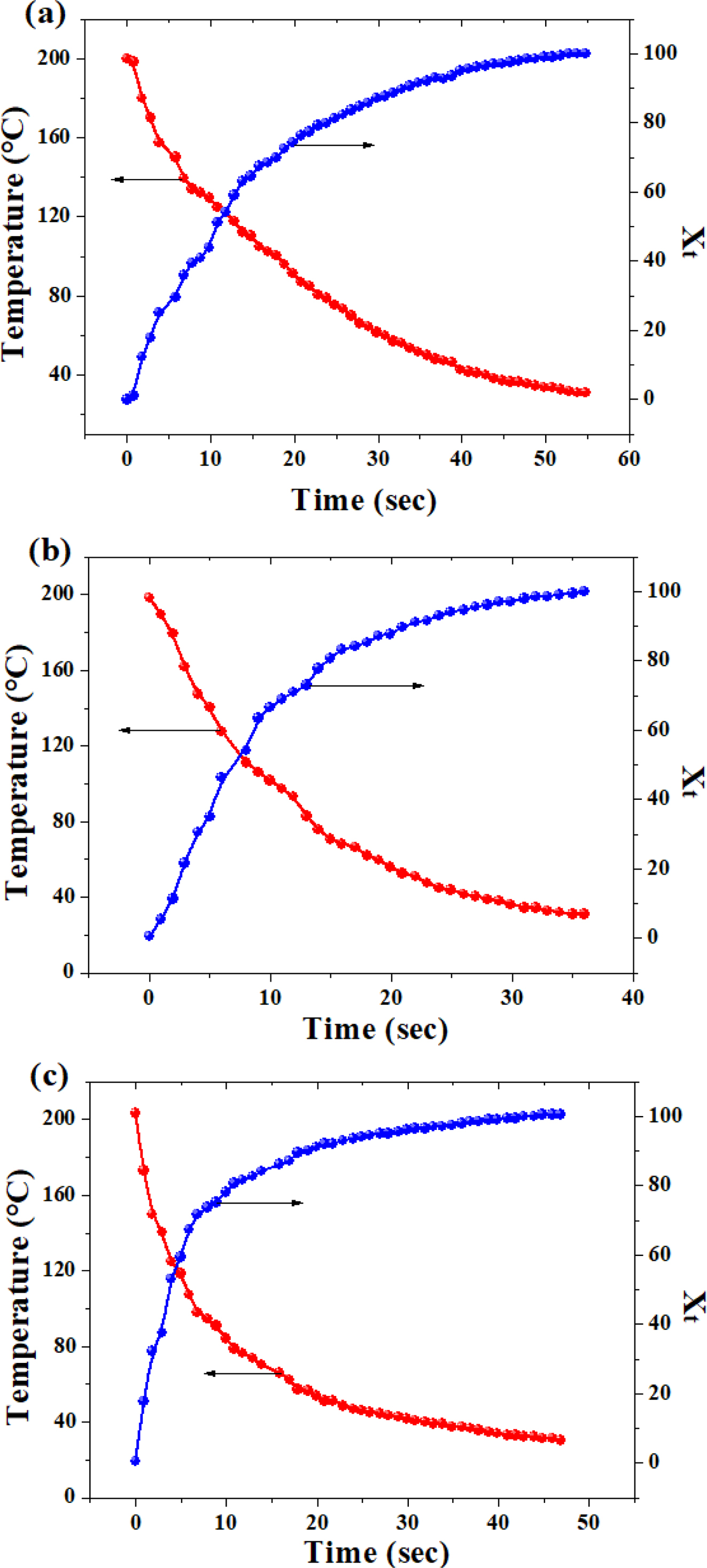 Figure 4 Variation of temperature and relative crystallinity (Xt) as a function of time: (a) neat PLA; (b) PLA/0.5%GN; (c) PLA/1.0%GN. |