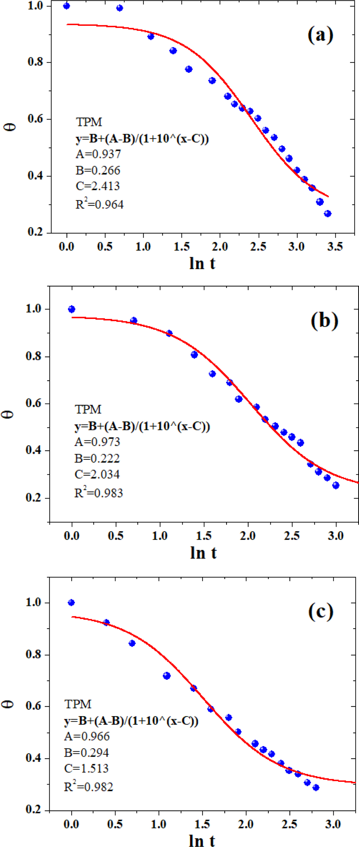 Figure 7 The non-linear curve fitting of dimensionless temperature (θ) versus ln t using TPM: (a) neat PLA; (b) PLA/0.5%GN; (c) PLA/1.0%GN. |
