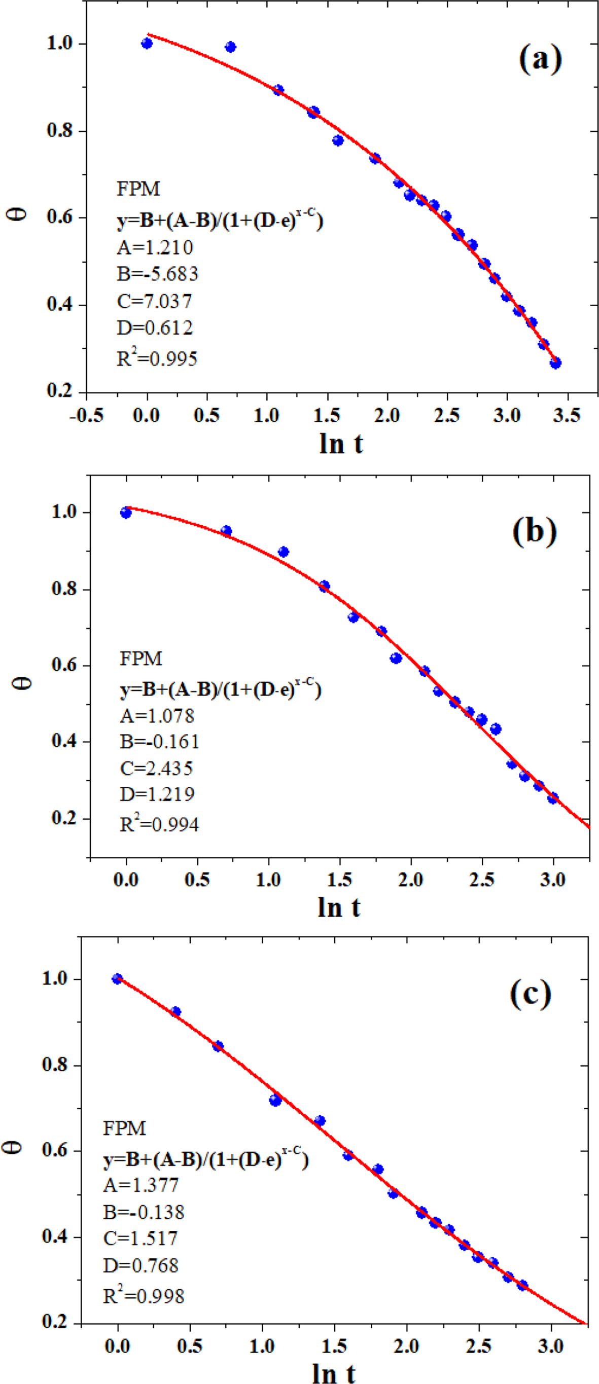 The parameters A, B, and C were similar to those defined earlier in eq. (9), and parameter D was the position-dependent coefficient. Figures 7 and 8 showed the non-linear curve fitting of dimensionless temperature (θ) versus lnt using TPM and FPM, respectively. All fitting parameters and the corresponding regression coefficient (R2) are listed in Table 3. Generally, the models could reasonably give the prediction of the temperature decay. FPM obviously presented even better fitting results,43-44as judged from the R2 values (cf. Table 3). In spite of the fact that the models are actually a phenomenological description of the phase-change behavior of crystalline polymers, the incorporation of latent heat and position corrections to FPM could better reflect the kinetic nature of crystallization process for of crystalline polymers (e.g., PE, PP, PLA, PET, etc.)