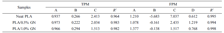where η* is the complex viscosity, η0 is the zero-shear viscosity, γ is the shear rate, and λ is the characteristic relaxation time. Here, n indicates the non-Newtonian exponent. Using the nonlinear fitting, all parameters was obtained and listed in Table 1 (all data have gone through several rounds of repetition). The viscosity drops with increasing GN% and temperature for all samples. As for the relaxation time (λ), the λ value of the PLA composites displayed a decreasing trend as a function of increasing temperature, considering that higher temperature always leads to higher motion ability of the macromolecular chains. However, the λ value of neat PLA displayed a different trend from the composites, which should be further investigated in our on-going work.