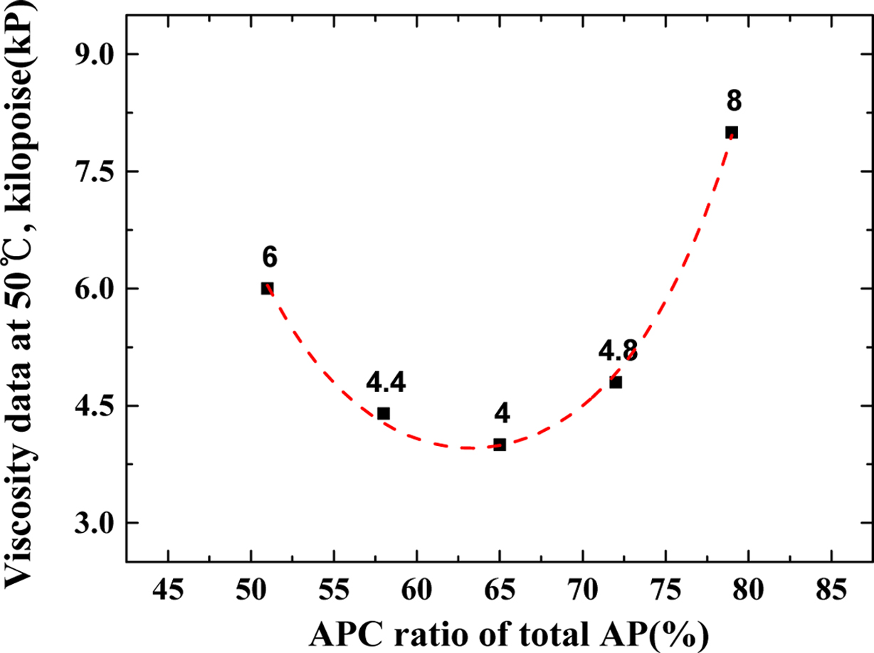 AP 혼합 비율에 따른 점도 변화. 본 실험의 경우 HTPB/AP 추진제를 사용하였으며, AP-200 μm, AP-6 μm의 AP를 사용하였다. 추진기관의 성능 유지를 위해 AP를 70 wt%, Al을 18 wt%로 고정하였다. AP 70 wt% 중에서 AP-200 μm와 AP-6 μm 비율 변화를 통해 점도 변화를 관찰하였다. 초기 점도 결과를 Figure 2에 나타내었다. HTPB/AP의 추진제에서 서로 입도가 다른 두 종류의 AP를 사용한 경우 큰 AP 입자 비율이 대략 60~70 wt% 범위에서 가장 낮은 점도를 나타낸 연구가 있다.3,6,9 실험 결과 AP-200 μm와 AP-6 μm 입자 비율이 65 wt%에서 4.0 kP(Kilopoise)로 가장 점도가 낮았다. HTPB/AP계 추진제에서는 다른 두 종류의 AP를 사용한 경우 큰 AP 입자 비율이 65 wt%에서 유변학적 특성, 즉 점도 개선 효과가 가장 우수하다고 판단한다.