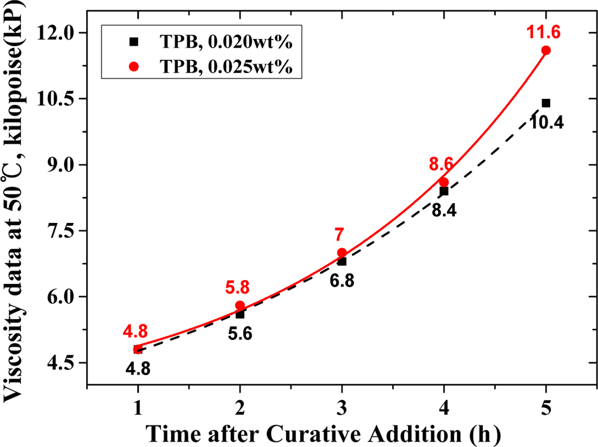 또한 일반적으로 추진제와 같은 복합재료의 합성 시 가장 중요하게 고려되는 것이 바로 촉매이다. 일반적으로 복합재료의 합성 시 촉매의 함량 조절을 통해 반응속도를 결정한다.6 하지만, 너무 많은 촉매를 사용하면 필러(filler)가 적절히 분산되지 못해 혼합물의 점도가 상승하며, 또한 점도 상승으로 빠져나가지 못한 기포 등에 의해 재료의 물성이 저하된다.7 반대로 촉매를 소량 사용할 경우 원하는 경도로 경화 반응이 진행되지 않을 수 있다. 이렇듯 촉매 함량 조절을 통해 추진제 점도를 낮추는 등 유변학적 특성 개선이 필요하다.