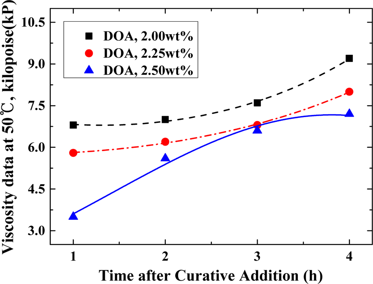 가소제 함량 변경에 따른 점도 변화. 가소제 함량에 따른 점도 변화를 Figure 5에 나타내었다. 본 실험은 총 AP 비율 중 AP-200 μm 비율을 약 72 wt%로 고정하였고, Fe2O3는 0.2 wt%, TPB 0.025 wt%로 고정하였다. 본 실험에서는 가소제 함량을 2.00, 2.25, 2.50 wt% 첨가였다. Table 2와 같이 가소제 함량 증가에 따라 공정성과 신율 모두 향상되었다. 또한 추진제의 신율이 증가할수록 장기저장성에 유리하다. 따라서 본 연구에서는 최대 신율을 나타내는 DOA 2.25 wt%가 가장 우수한 함량이라고 판단한다. DOA 2.50 wt%를 첨가한 경우 더 이상의 Em 증가는 없으며 Sm이 떨어지는 결과를 나타내었다.