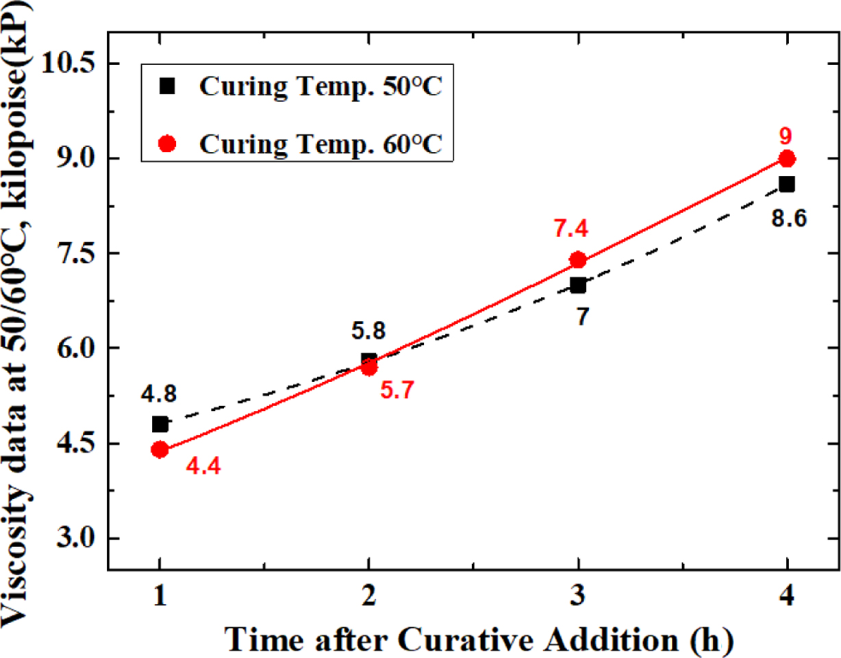 최종 혼화 온도 변경에 따른 점도 변화. 일반적으로 우레탄 결합의 반응 속도는 온도가 상승할수록 빨라진다.11 따라서 추진제의 온도가 상승할수록 경화반응이 빠르게 일어나 추진제의 점도가 상승한다. 하지만, 액체의 경우 온도가 상승할수록 점도가 낮아지는 특성이 있다.12 따라서 슬러리 상태 추진제의 최종 혼화 온도는 공정성에 상당히 중요한 영향을 끼친다.