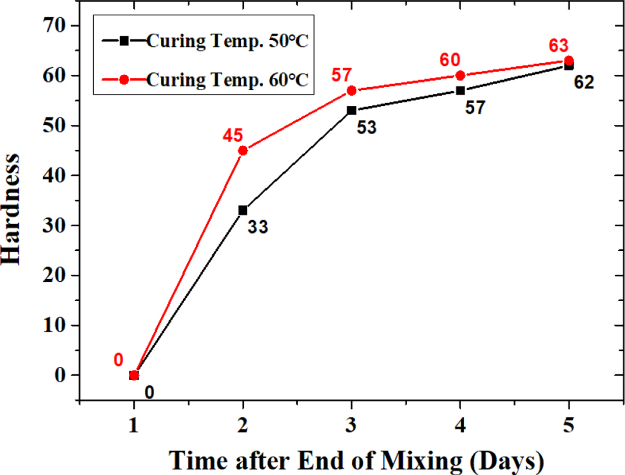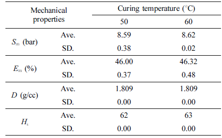 본 연구에서 최종 혼화 온도에 따른 추진제 점도 상승을 Figure 6에 나타내었다. 혼합이 끝난 후 4시간 동안 점도 차이는 크지 않았다. 조금 더 긴 시간 동안 경화 온도에 따른 경화반응을 확인해 보았다. Figure 7에 경화일에 따른 추진제 경도를 나타내었다. 60 oC에서 경화한 추진제가 초기 경화 3일차까지는 경화속도가 빠르지만 경화 5일차의 최종 경도는 차이가 없다. 또한 추진제의 물성에도 차이가 없었다. Table 3의 경화한 추진제의 물성을 나타내었다. 신율, 강도, 경도 모두 차이가 없는 것을 알 수 있다.