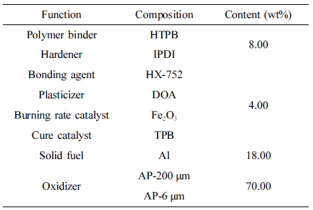 추진제 제작. 추진제 제작 시, 바인더로 삼양화학공업(주)의 HTPB(hydroxyl terminated polybutadiene)를 사용하였으며, 경화제로 Bayer Material Scienece LCC 사의 IPDI (isophorone diisocyanate), 가소제로 LG화학의 DOA(dioctyl adipate), 결합제로 ㈜거원기술의 HX-752(isophthaloylbis(2-methyl-aziridine))를 적용하였으며, 금속연료는 ㈜창성의 aluminum을, 산화제로는 ㈜한화의 AP를 사용하였다. AP는 두 종류로서 평균 입경은 큰 입자(이하 APC라 칭함) 가 200 μm, 작은 입자(이하 APF라 칭함)는 6 μm이었다. 연소촉매로는 Elementis Pigments Inc.의 Fe2O3를 사용하였다. 경화촉매는 동인화학(주)의 TPB(triphenylbismuth)를 사용하였다. 당량비는 0.750으로 제조하였으며 경화는 5일 진행하였다. Table 1에 해당 추진제 조성을 표기하였다.