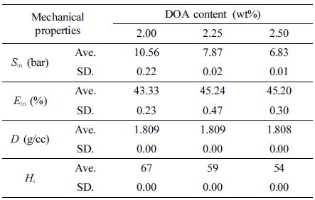 4. 가소제 함량 증가에 따라 공정성과 신율 모두 향상되었다. 따라서 본 연구에서는 최대 신율을 나타내는 DOA 2.25 wt%가 가장 우수한 함량이라고 판단한다. DOA 2.50 wt%를 첨가한 경우 더 이상의 Em 증가는 없으며 오히려 Sm이 떨어지는 결과를 나타내었다. 유변학적 특성 개선을 위해서는 가소제 함량이 증가할수록 좋지만 과량을 첨가하면 재료의 물성에는 부정적인 영향을 끼친다.