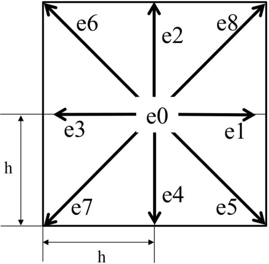 The weighting factor for the D2Q9 model is 4/9 for α = 0; 1/9 for α = 1, 2, 3, 4; and 1/36 for α = 5, 6, 7, 8. Figure 2 illustrates the momentum discretization for a two-dimensional calculation, where the virtual fluid particles at each node move to eight intermediate neighbors with eight corresponding velocity vectors: