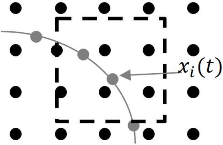 where the kernel δ(X - xi(t)) is a discretized Dirac delta function with a finite support. Under the action of the distributed fluid forces, the particles’ motion is determined by their displacements and velocities. In this study, the interpolation function (φn, n= 2) was selected for the common decomposition, δ(r) = φ(x)φ(y):
