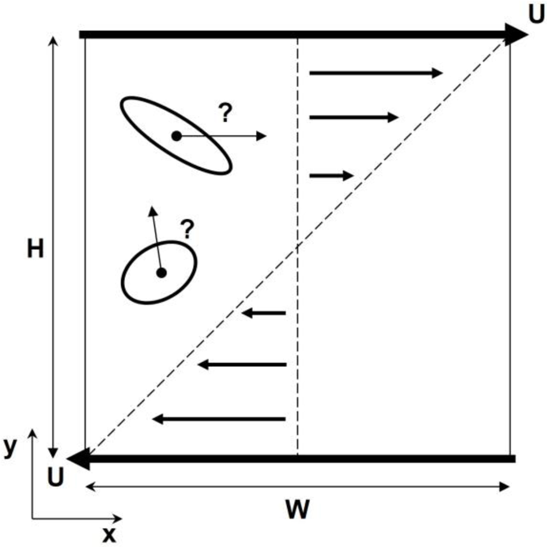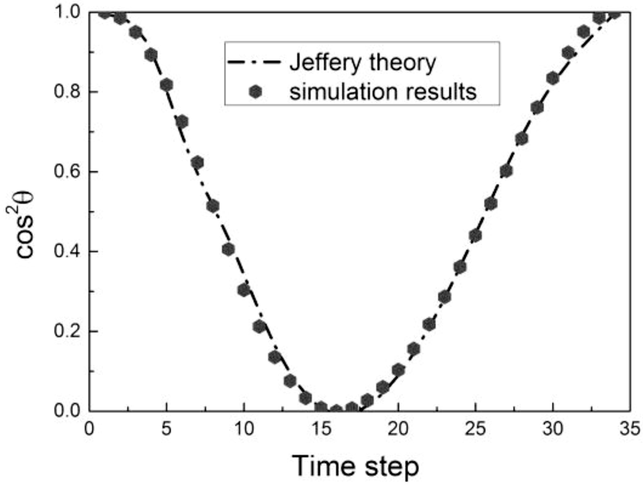 Validation. To validate our model, the Jeffery’s orbit of a suspended spheroid in an unbounded shear flow was used.30 The theoretical solution by Jeffery for the rotational motion of the main symmetry axis was as follows: