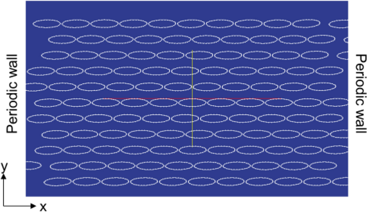 where is the fluid distribution after collision and  is the inverse direction of i and uw is the velocity along the wall. Periodic boundary conditions were applied on the right, a and uw is the velocity along the wall. Periodic boundary conditions were applied on the right, and left walls,32 as shown in Figure 5. Four different aggregate shapes were considered by changing the aspect ratio AR, as summarized in Table 1, and the total area of the particles in all the cases was maintained. The algorithm for successfully determining the particle behavior must be chosen based on the following considerations. If the mesh on the particle surface is too coarse, there may be ‘holes’ in the particle surface and fluid may penetrate. If the mesh is too fine, velocity interpolations become less accurate, which can cause the simulation to crash. Due to the finite-range interpolations, the flow field around the particle surface would be about 0.3–0.5 Δx(the lattice spacing).33 The selected value in this study for the distance between nodes was 0.5 Δx. The initial configuration of the particles in the fluid domain is shown in Figure 6. In this study, the Brownian motion was neglected due to the high Peclet number. The Stokes number St for this system was about 0.0013, which indicates that fluid-solid coupling was strong and could lead to non-Newtonian behavior when St ≪1.34