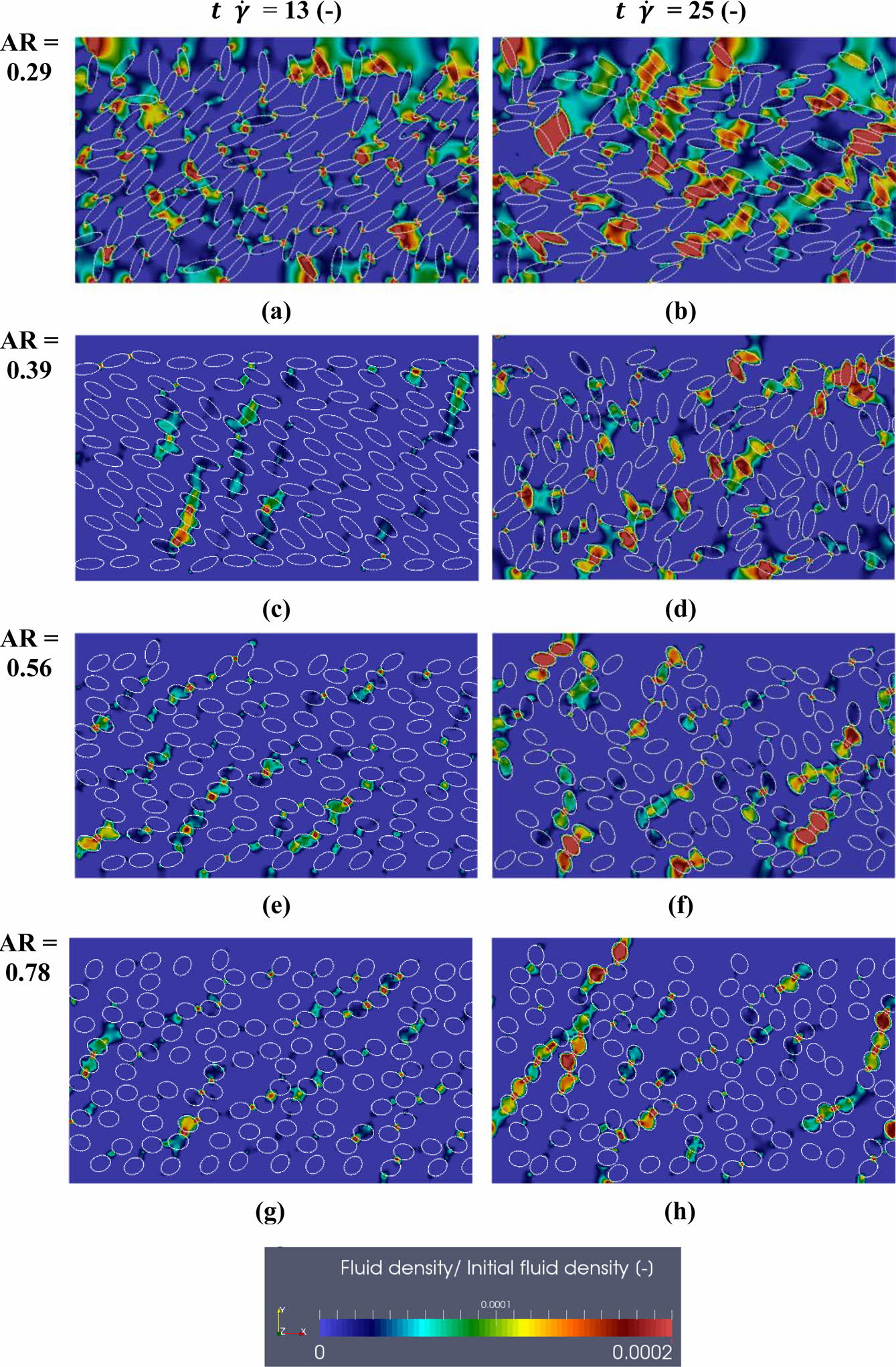 As shown in Figure 7, as AR varied, fluid density distributions in the calculated fluid domain appeared for AR = 0.29–0.78 at non-dimensional times of 13 and 25, separately. At a non-dimensional time of 13, the particles tended to move along the flow direction for all cases. The particles near the wall with an applied shear force nearly maintained their initial state, except when AR = 0.29. However, the particles located near the centerline experienced tumbling motion with an ordered structure. At a non-dimensional time of 25, the particles exhibited disordered structures for all cases. The spheroidal particles showed intriguing behaviors, especially for AR =0.29 and 0.39, as shown in Figures 7(a)-(d), in which their shapes promoted rolling or tumbling motions when a shear flow was applied.25 Such remarkable particle behaviors led to more connections with the surrounding particles with steric interactions, binding the particle hydrodynamic cluster chains. The rotational motion determined the motion characteristics of almost all the particles at high particle Reynolds numbers.35 Based on the interactions between the tumbling and rotational motions from the vorticity caused by the shear flow and the collisions with obstacles by the translational motion of the particles, the repulsion on the particle surfaces were due to hydrodynamic effects. Furthermore, in the higher density regime, i.e.over-crawling regime, the distribution expanded partially with decreasing AR, where particles tend to push into groups.36 The elongated surfaces of the particles led to partial concentrations for two reasons: the deflection of the flow lines of the fluid surrounding the particles was less sensitive for the same-sized spheres, and the increased particle surface enhanced the probability of particle-particle interactions. This frequently occurs for high shear rates and high particle volume fractions because the microstructure transitions to a disordered state.37 Above AR = 0.56, the particles with flowing fluid exhibited uniform alignment because the number of particle-particle interactions decreased, and these particles could change their orientation to the flow direction (x-direction). For the highest value of AR examined, which was close to a spherical shape (AR = 0.78), the simpler geometry and lower surface area than those of the oblate spheroidal aggregate experienced a reduction in friction, which promoted a sliding process.
