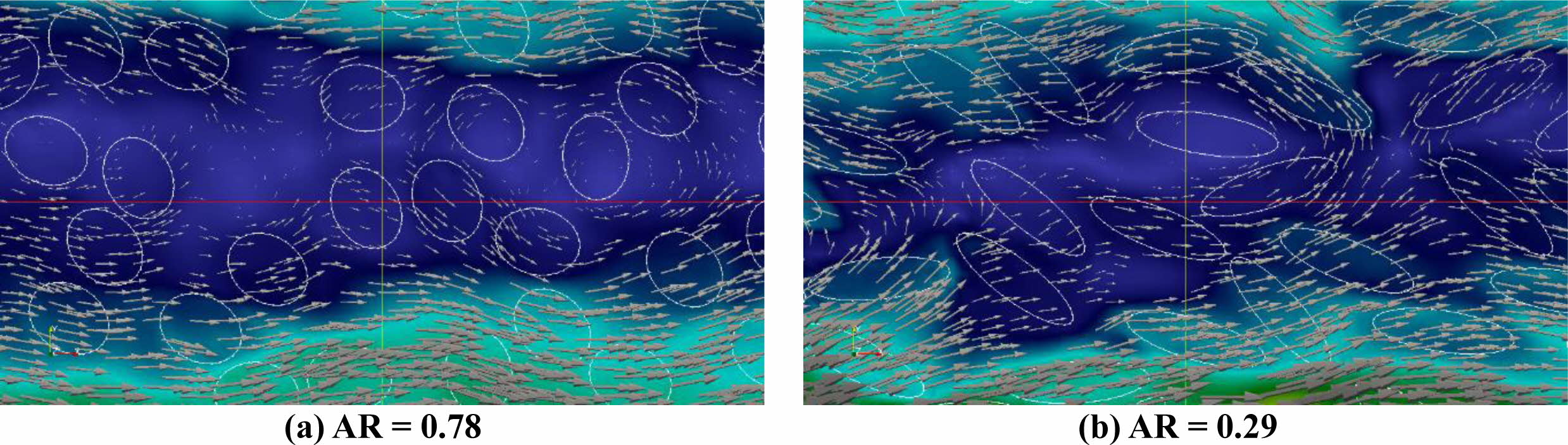 To better understand the relationship between the particles and fluid, the fluid velocity magnitude contours and vector field near the center region are shown in Figures 8(a) and 8(b), respectively. The vector size in this figure corresponds to the velocity magnitude. The deflection of flow lines by vectors near the particles for AR = 0.29 was stronger than that in the case of AR = 0.78. Thus, the particle positions can alter the fluid patterns, resulting in regions of high particle concentrations.
