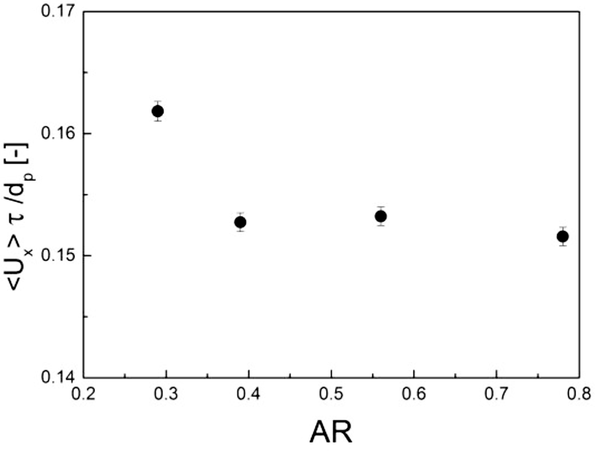 The translational velocity vx along the shear flow is shown in Figure 9, which was averaged over all times and particles. Interestingly, the AR = 0.29 case showed the highest translational velocity in the x direction. Furthermore, the cases for AR = 0.39 and 0.56 were somewhat similar. Due to the partially grouped elongated particles, partial jamming clusters appeared, as shown in Figure 7, which promoted a higher translational motion due to inertia. Furthermore, the hydrodynamic force compressed the group of particles due the collisions of particles, despite the repulsion forces.