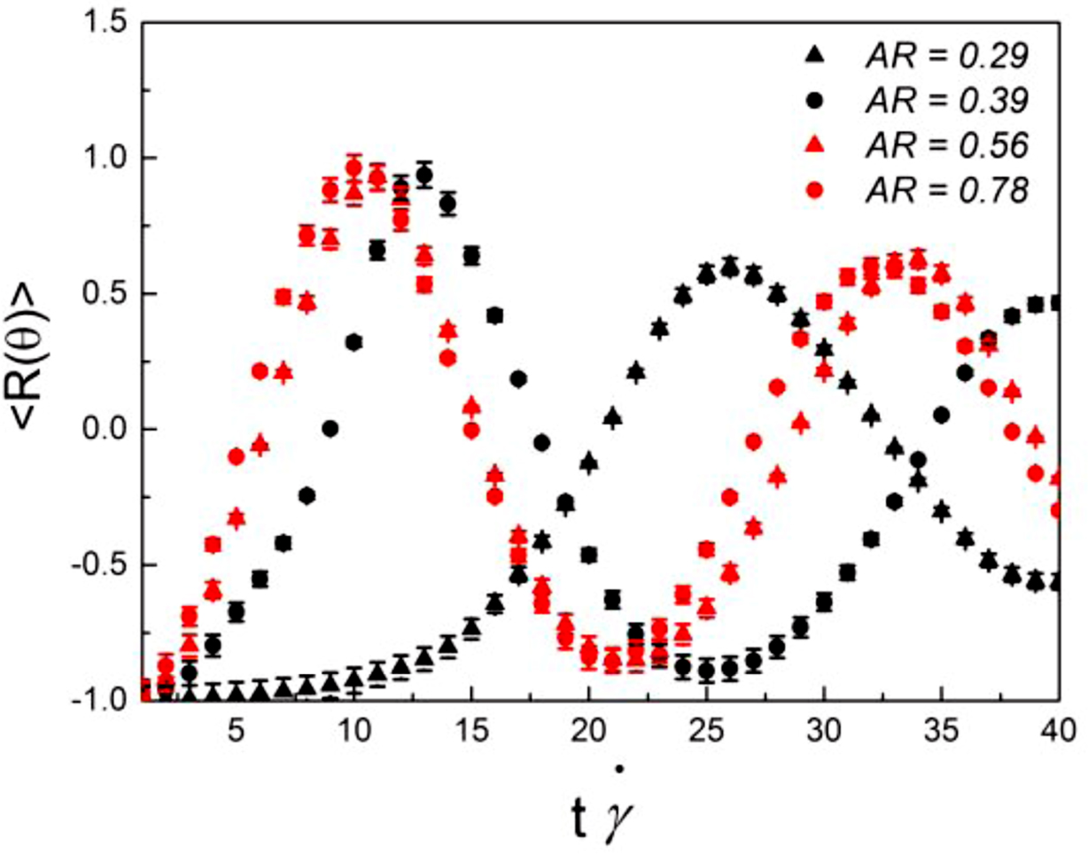 The cases for AR = 0.39, 0.56, 0.78 exhibited similar. However, the case AR = 0.29 showed the long wavelength than other cases with increasing t. Furthermore, the elongated particle by the rotational motions increased the particle-particle interactions that can also hinder the rotation as obstacles.