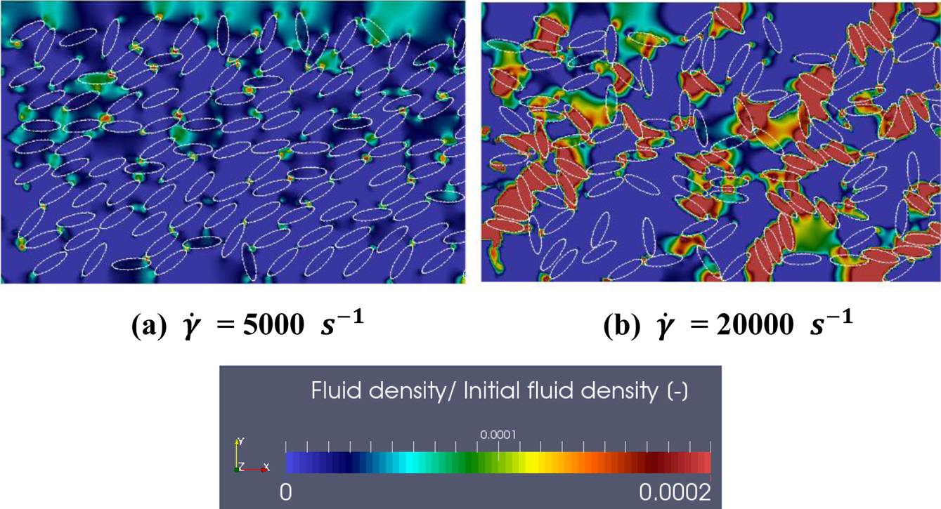 The particle distributions with varying  ( = 5000, 20000 s-1) are illustrated in Figures 12. For = 5000 s-1, the particles followed the direction of the flow, and the high-density distribution regime was reduced compared with the previous cases shown in Figure 7(b). However, the over-crowding region was extended for = 20000 s-1, and particle clusters elongated. Concentrated particle regions due the flow deflection increased the local shear rate and created a disordered state. Some of the particles formed high packing fraction regions. The increased shear force accelerated the concentrated density distribution.