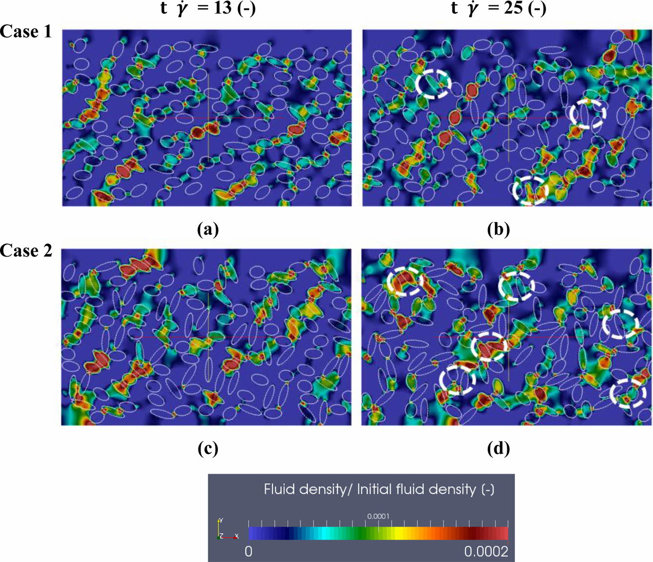 To elucidate the effect of mixed particle shapes in the system, we examined two cases containing mixed three different types of particles (AR = 0.29, 0.56, and 0.78), in which fractions for the different particle types were changed, as summarized in Table 2. As shown in Figures 13, for cases 1 and 2, at t= 13, the particles were uniformly distributed in the suspension. Such behavior resulted from the ordered state of the particles under the applied shear, and the particles aligned themselves to the shear direction. At t  = 25, for cases 1 and 2, net clusters and structures were formed by the elongated particles (illustrated as white dot circles in Figures 13 (b) and (d)). The elongated particles (AR = 0.29) acted as bridges that could act as obstacles and create interconnections between the different types particles (AR = 0.56, 0.78), resulting in strong interactions due to the specific structures of the particles. Such interactions occurred due to the greater number of the surface connections. As the number of elongated particles (AR = 0.29) increased, for case 2, the positions of the jamming clusters partially reinforced the clusters, making it difficult to strip particles. Thus, the cooperation with lower AR particles allowed aggregation to occur more easily than when only nearly spherical particles were present.