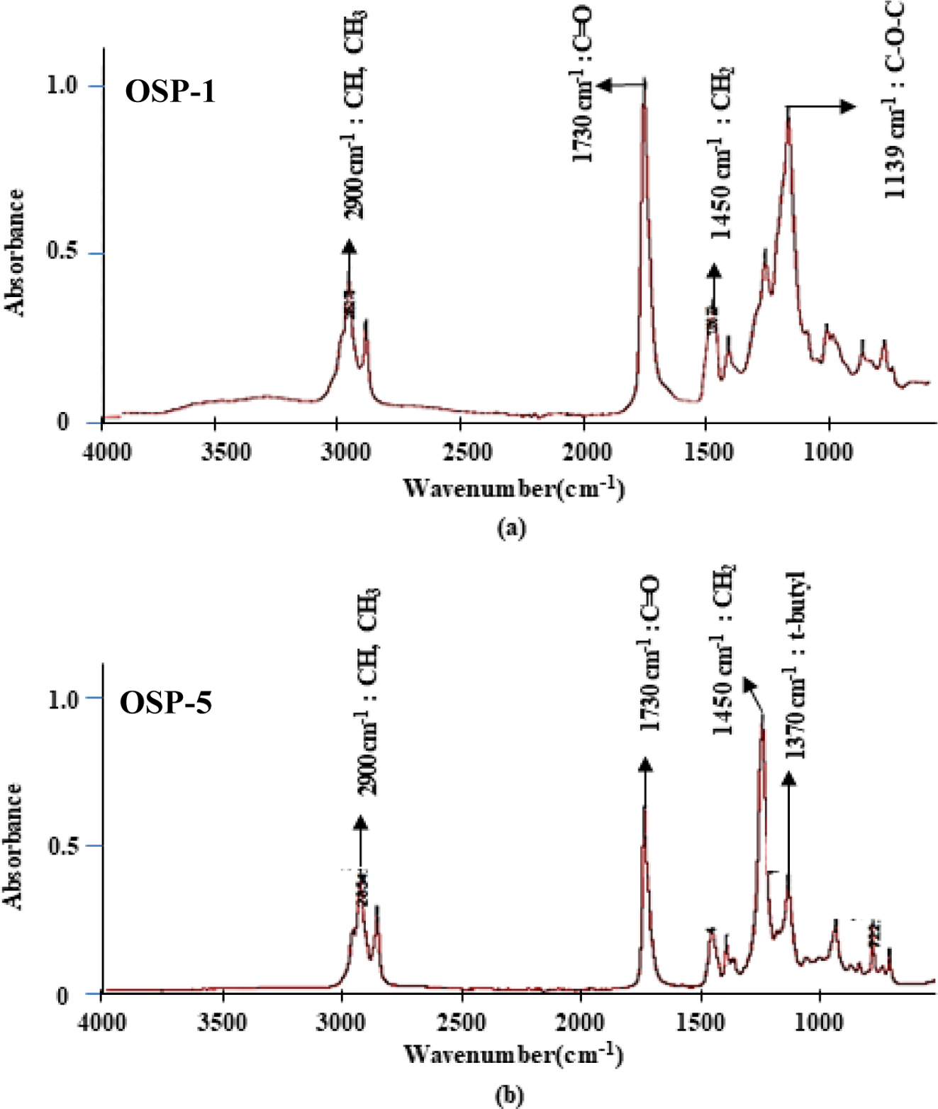 Figure 2 Figure 2. FTIR spectra of oil-soluble acrylate copolymers: (a) poly (MMA-co-n-BMA-co-SMA-co-AA); (b) poly(MMA-co-t-BMA-co-SMA-co-AA). |