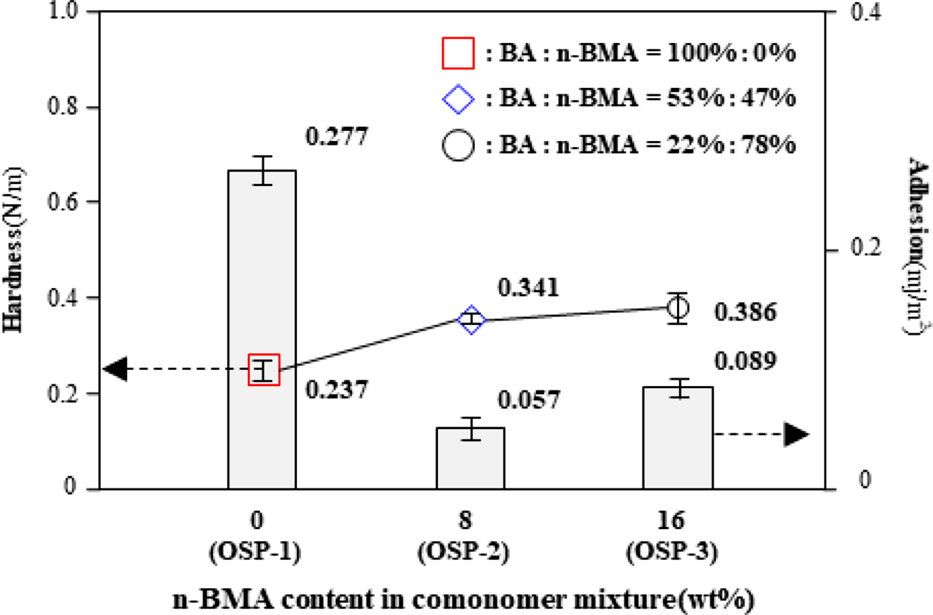 Figure 3 Figure 3. Variation of hardness and adhesion force for OSP-1, OSP-2, and OSP-3 depending on BA and n-BMA composition. |