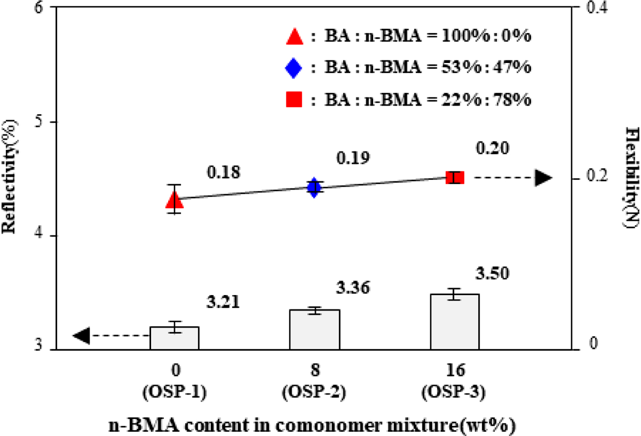 Figure 4 Figure 4. Variation of reflectivity and flexibility for OSP-1, OSP-2, and OSP-3 depending on BA and n-BMA composition. |
