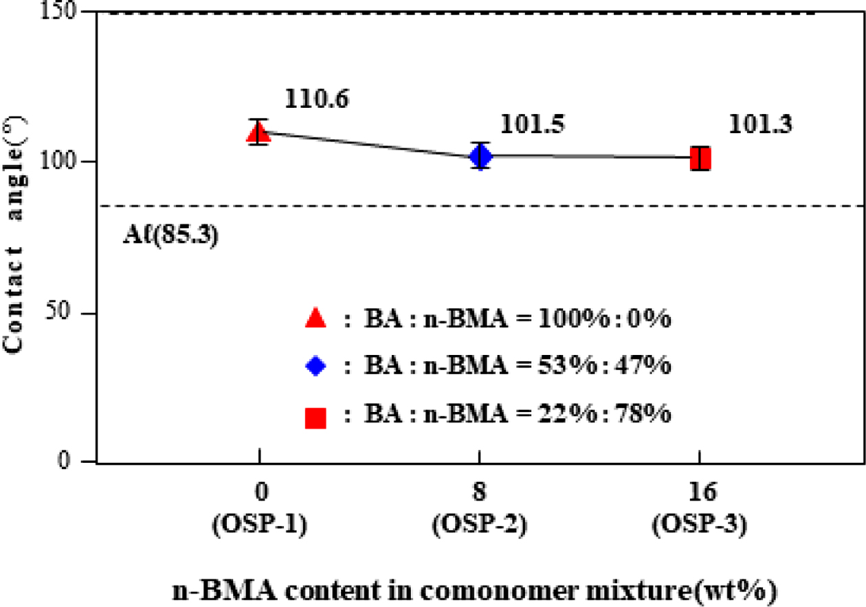 Figure 5 Figure 5. Variation of contact angle for OSP-1, OSP-2, and OSP-3 depending on BA and n-BMA composition. |