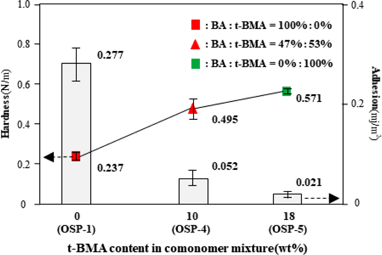 Figure 6 Figure 6. Variation of hardness and adhesion force for OSP-1, OSP-4, and OSP-5 depending on BA and t-BMA composition. |