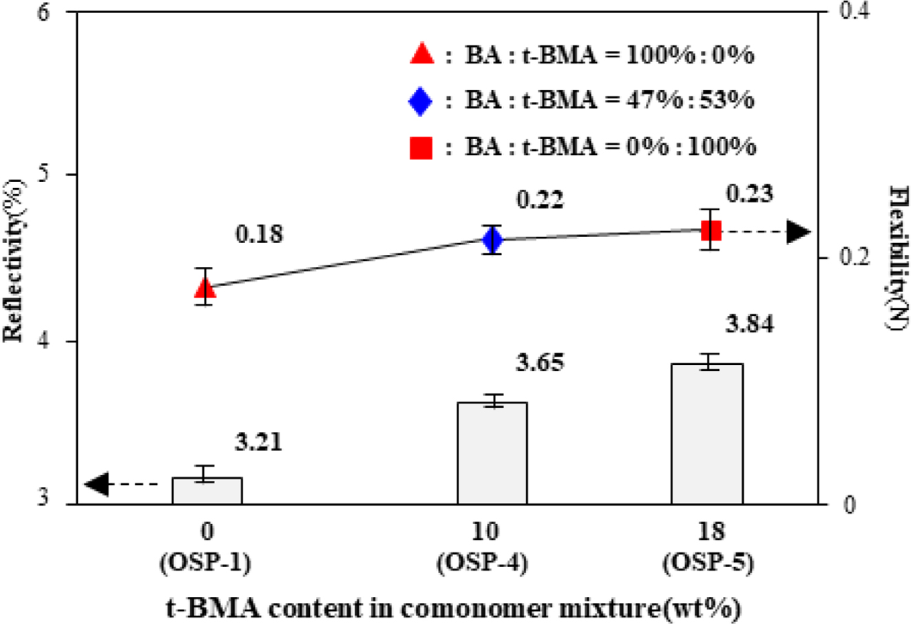 Figure 7 Figure 7. Variation of reflectivity and flexibility for OSP-1, OSP-4, and OSP-5 depending on BA and t-BMA composition. |