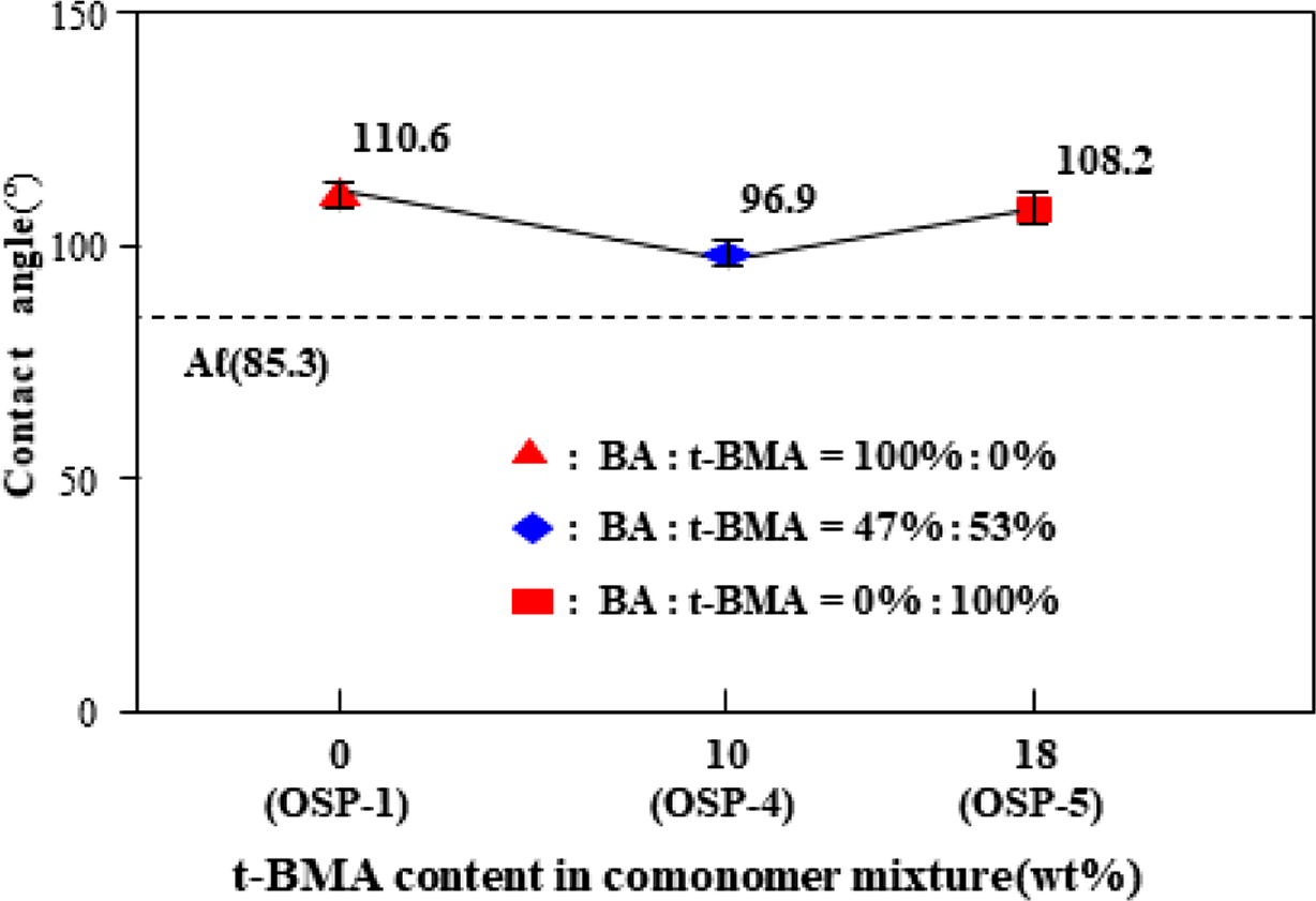 Figure 8 Figure 8. Variation of contact angle for OSP-1, OSP-4, and OSP-5 depending on BA and t-BMA composition. |