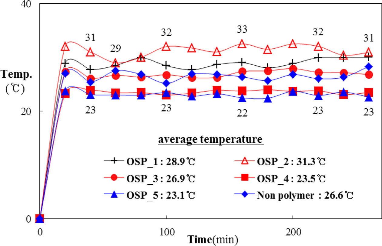 BA, n-BMA 및 t-BMA 조성비에 따른 열전달 온도 변화: Figure 9에 유용성 아크릴레이트 공중합체를 열 계면 소재로 사용했을 때의 시간에 따른 열전달 온도 변화를 나타내었다. 열 계면 소재를 사용하지 않은 알루미늄 슬러그 적층시료 자체의 열전달 온도는 평균 26.6 ℃를 나타내었다. 이렇게 낮은 열전달 온도를 나타낸 이유는 알루미늄 슬러그간 계면 사이에 형성된 공극 공기층이 열 저항을 크게 발생시켰기 때문이었다. OSP-1 또는 OSP-2를 열 계면 소재로 사용하였을 때는 알루미늄 슬러그 적층시료 자체만을 사용했을 때보다 열전달 온도가 상승하였다. 유용성 아크릴레이트 공중합체 중 BA 10%와 n-BMA 8% 조성을 가지는 OSP-2가 가장 높은 열전달 온도 값을 나타내었다.