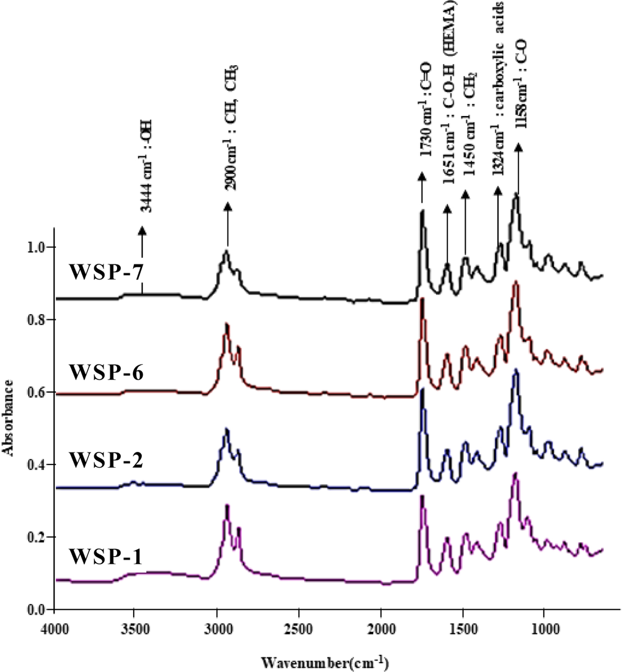 Figure 10 Figure 10. FTIR spectra of water-soluble acrylate copolymer WSP-1, WSP-2, WSP-6, and WSP-7. |