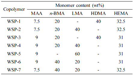 실험 재료. 본 연구에서 아크릴레이트계 공중합체 합성에 사용되는 아크릴 단량체로는 stearyl methacrylate(SMA, 미원상사), acrylic acid(AA, LG화학), methyl methacrylate(MMA, LG MMA), t-butyl methacrylate(t-BMA, BASF), n-butyl methacrylate(n-BMA, LG MMA), n-butyl acrylate(BA, LG화학), lauryl methacrylate(LMA, BASF), hexadecyl meth-acrylate(HDMA, Sigma-Aldrich), 2-hydroxyethyl methacrylate (HEMA, Sigma-Aldrich) 및 methacrylic acid(MAA, Sigma-Aldrich) 중에서 선택적으로 선정하여 사용하였다. 중합반응 개시를 위한 열 개시제는 benzoyl peroxide(BPO, 한솔케미칼)를 사용하였고 중합 용매로는 dicaprylyl carbonate(dioctylester, BASF) 및 무수 에탄올(한국 알콜)을 사용하였다.
