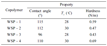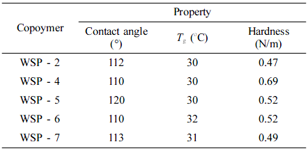 LMA 및 HDMA 함유에 따른 물성 변화: 공단량체로 LMA 또는 HDMA를 함유하는 아크릴레이트 공중합체에 있어서 공단량체가 물성변화에 미치는 영향을 조사하였다. Table 3에 나타낸 바와 같이 MAA 함량 7.5% 및 HEMA 함량 32.5%의 고정 조성에서 LMA 또는 HDMA를 공단량체로 사용하여 합성된 아크릴레이트 공중합체의 Tg, 접촉각 및 경도를 보면 HDMA를 사용한 WSP-1은 LMA를 사용한 WSP-2 보다 경도와 접촉각은 높은 반면 Tg는 낮은 물성을 나타내었다. 반면, MAA 함량 9% 및 HEMA 함량 31%의 고정 조성에서 LMA 또는 HDMA를 공단량체로 사용하여 합성된 아크릴레이트 공중합체의 경우 LMA를 사용한 WSP-4가 HDMA를 사용한 WSP-3보다 접촉각이 훨씬 크고, Tg가 약간 증가하였다.