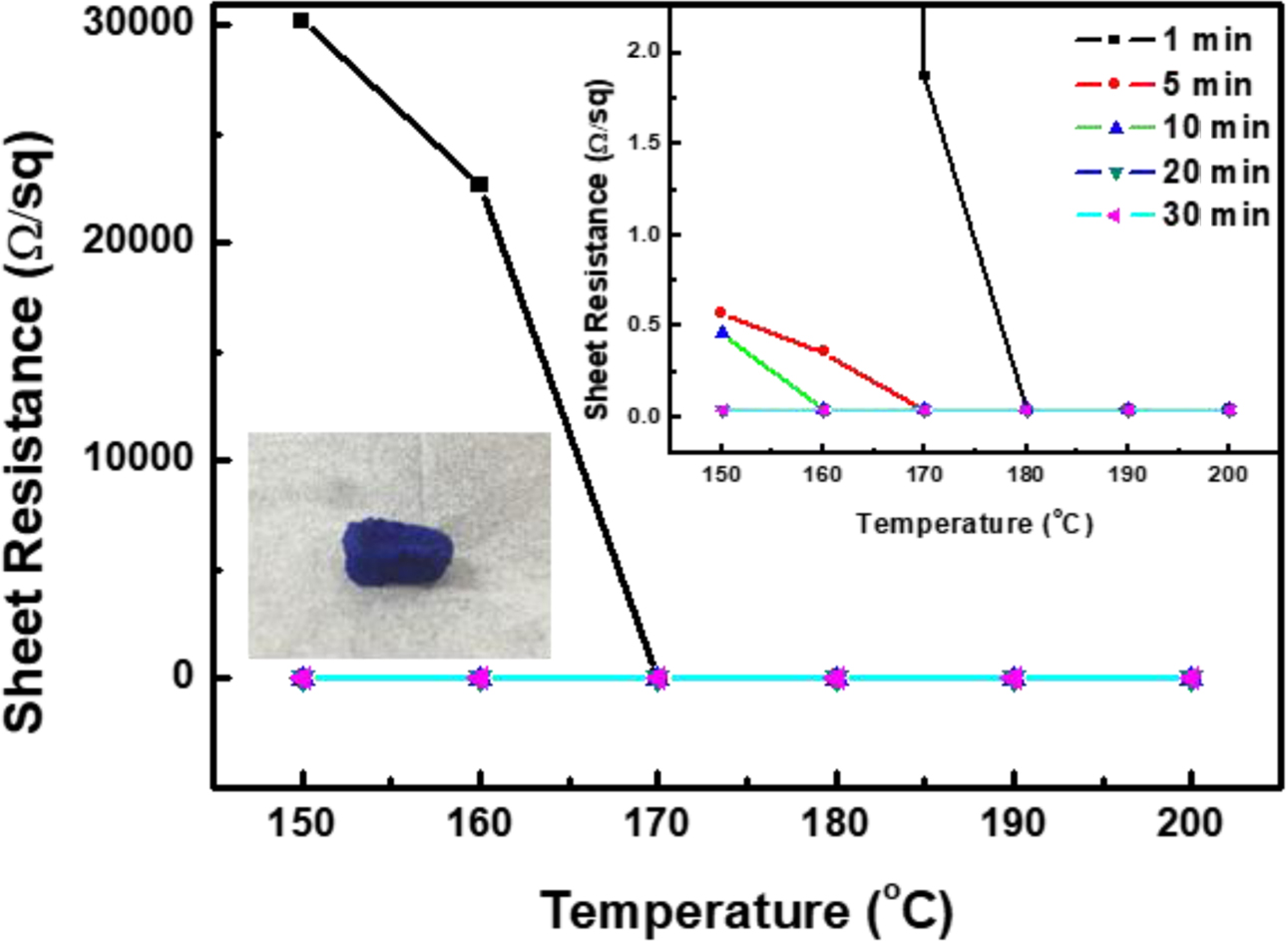 이는 Scheme 1에서 제시한 바와 같이 구리 전기전도층 내의 구리 입자들간의 접촉으로 이해할 수 있는데 고체상태 구리 전구체 잉크를 소결하면 초기에 복합체 내에서 구리 입자가 생성되기 시작하고 그 후에 복합체의 모든 구리 전구체가 구리 입자로 바뀌지만 파라핀 왁스는 완벽히 열분해되지 않고 구리 입자 사이에 남아 구리 입자들간의 접촉을 방해하여 높은 면저항이 나타나고 더 소결하게 되면 구리 입자 사이에 남아있던 파라핀 왁스도 모두 열분해되어 결과적으로 구리 입자간의 접촉이 증가하게 되므로 낮은 면저항이 나타나게 된다.