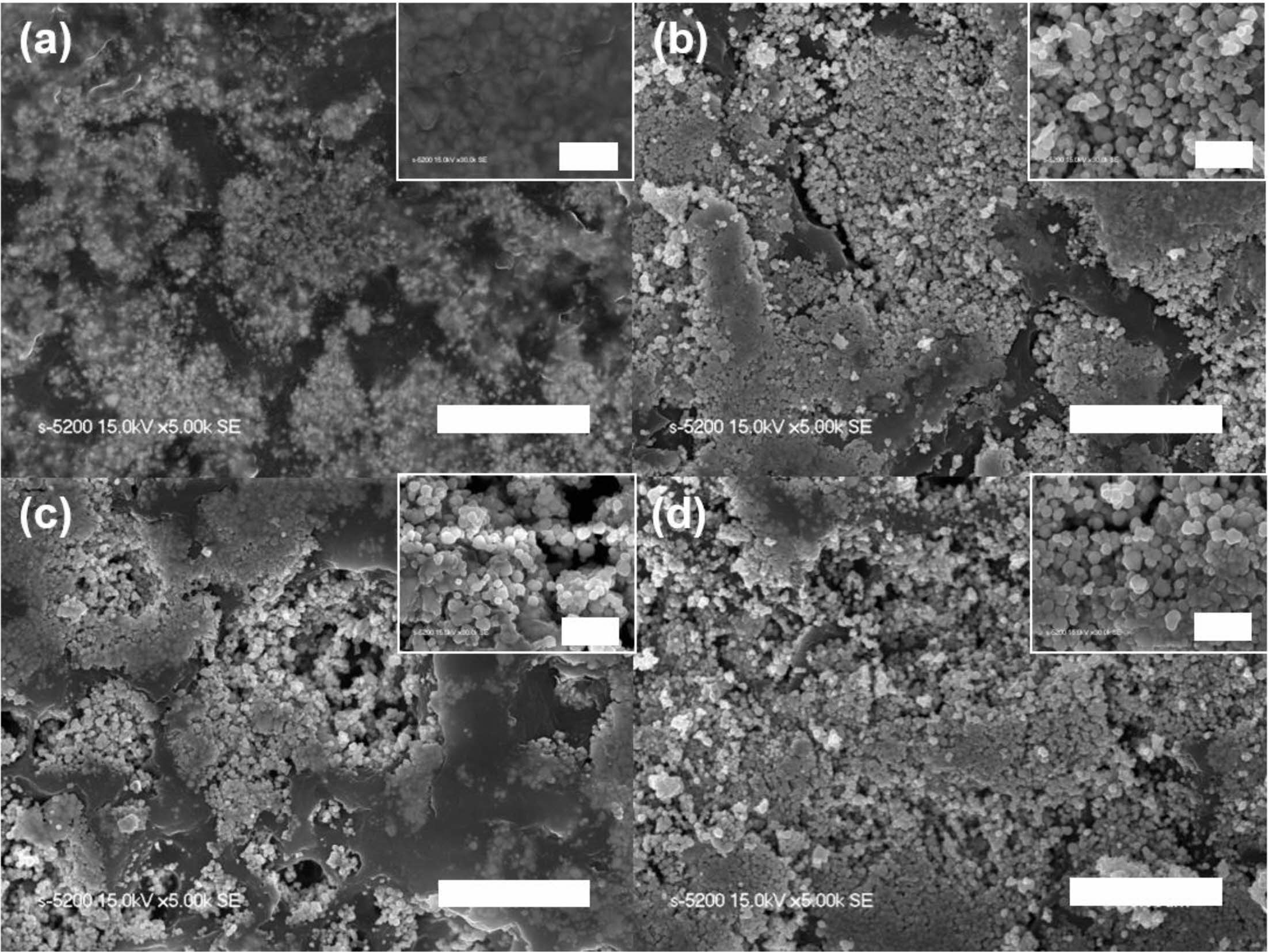 SEM images of the copper conductive layer sintered at 160 ℃ with different sintering time: (a) 1 min; (b) 10 min; (c) 20 min; (d) 30 min (scale bars = 6 μm; scale bars of inset = 1 μm).
