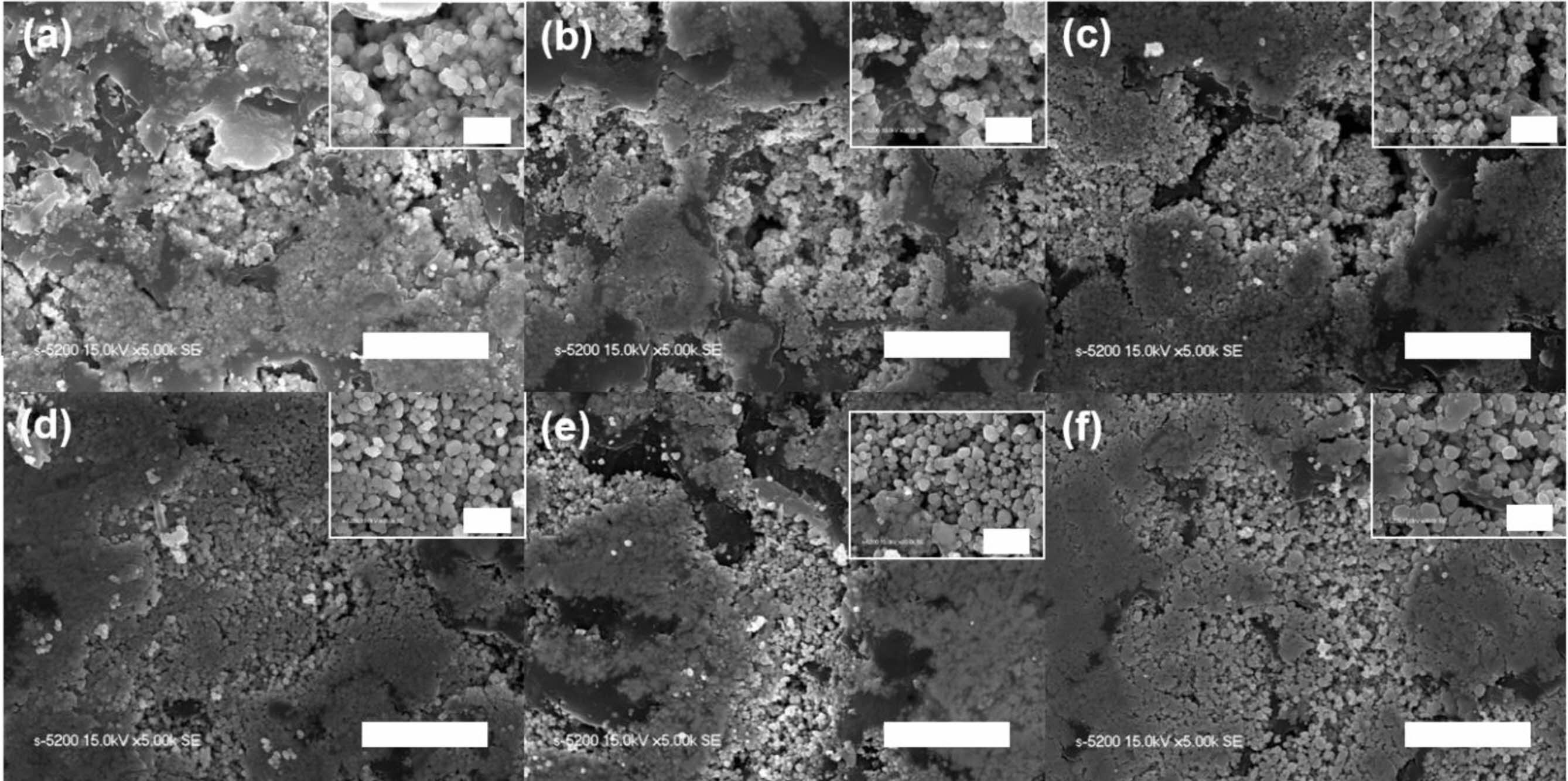 SEM images of the copper conductive layer sintered for 5min with different sintering temperatures: (a) 150 ℃; (b) 160 ℃; (c) 170 ℃; (d) 180 ℃; (e) 190 ℃; (f) 200 ℃ (scale bars = 6 μm; scale bars of inset = 1 μm).