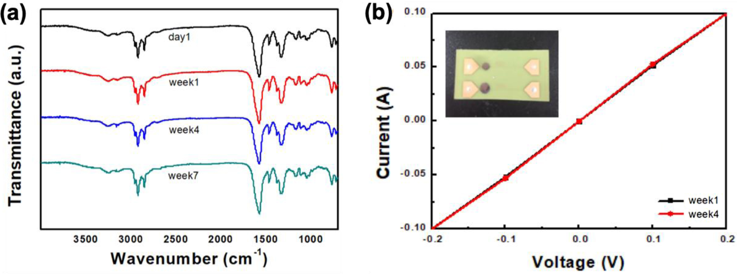 본 연구에서 제조된 고체상태 구리 전구체 잉크의 저장성을 확인하기 위하여 장기간의 FTIR 측정을 진행하면서 시료와 연관된 특성 피크들의 변화를 관찰하였다(Figure 4(a)). 시료의 측정 기간은 고체상태 구리 전구체 잉크가 제조된 첫째날(day 1)부터 최대 7주까지 진행되었다. 주요 관찰 특성피크들은 3250과 3150 cm-1에서 N-H stretching vibration, 2950과 2840 cm-1에서 C-H stretching vibration, 1570과 1390 cm-1에서 carboxylate stretching vibration, 1460 cm-1에서 N-H deformation vibration, 그리고 1200과 1020 cm-1에서 C-N stretching vibration의 저장시간에 따른 변화를 관찰하였다. 그 결과 적외선 분광 스펙트럼의 시료 특성 피크들은 최장 7주의 저장기간 동안 변화를 확인할 수 없었으며, 이는 저장기간 동안 액체상태의 전도성 잉크와 달리 구성 소재간의 상분리가 발행하지 않고 포름산 구리와 옥틸아민이 결합하여 형성된 복합체를 잘 유지하고 있음을 나타낸다. 따라서 이러한 결과는 기존 액체상태의 전도성 잉크와 비교 시 매우 우수한 저장성을 나타내는 결과이다. 저장 시간에 따른 구리 전기전도층의 전기적 특성 또한 Figure 4(b)에서 확인할 수 있다. 이를 위해 우선 미리 제조된 구리 패턴 상에 한 부분을 단선하고 제조한 고체상태 구리 전구체 잉크를 단선된 위치에 소결하여 구리 전기전도층을 형성하였다. 고체상태 구리 전구체 잉크로 형성된 구리 전도층을 제조 1주(week1)와 4주(week4) 후에 전류-전압 곡선(I-V curve)을 측정하여 시간에 따른 전기적 특성의 변화를 관찰하였다. 그 결과 시간에 따른 전류-전압 곡선의 현저한 기울기 변화를 관찰할 수 없는 것을 확인하였으며, 이는 본 연구에서 제조된 고체상태 잉크의 우수한 저장성과 함께 전기적 특성이 유지되고 있음을 보인다.