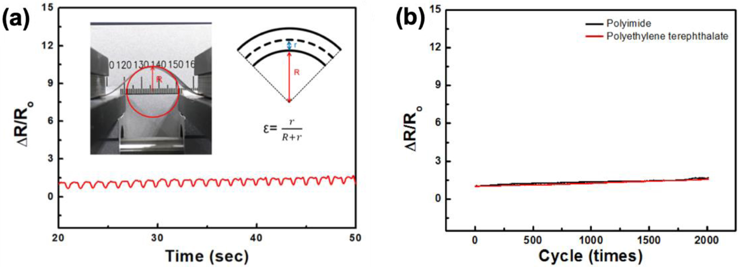 본 연구에서 제조된 고체상태 구리 전구체 잉크를 사용하여 PET 또는 PI 등의 유연한 고분자 기재 위에 선형 패턴을 인쇄한 후 이들 시료에 굽힘 변형(bending strain)을 가하는 동시에 전기적 특성을 측정하여 유연전극으로의 활용성에 대하여 시험하였다. 제조된 시료의 물리적 변형에 따른 저항은 Keithley 2400 General-Purpose Source Meter가 달린 직접 제작된 반복 인장 실험기에 고정되어 cycle 수에 따른 저항 변화를 관측하였다. Figure 5(a)에서 먼저 inset에서 제시되는 굽힘변형률 관계를 사용하여 PET 필름 상에 선형 구리패턴을 제조한 후 10%의 반복적인 굽힘변형을 적용하면서 저항 변화를 측정하였다. 재료에 물리적 변형이 가해질 때마다 구리 전기전도층뿐만 아니라 기판에도 물리적 변형이 가해지기 때문에 상대적 저항 변화 비(ΔR/Ro)가 조금씩 증가하다 회복되는 것을 확인하였다. 그러나 반복 굽힘변형에 따른 저항의 변화량이 크지 않고 지속적으로 일정한 범위를 유지하는 것을 확인할 수 있다. 이는 본 연구에서 제조된 고체 잉크를 사용하여 형성된 구리 전기전도층이 우수한 기계적 안정성을 갖고 있음을 의미한다.21 또한 PET 필름과 함께 polyimide(PI) 필름에도 선형 구리패턴을 형성하여 반복 굽힘 변형 실험을 진행하였다(Figure 5(b)). 2000회 이상의 반복 굽힘 변형을 적용하여도 전기적 특성의 큰 변화를 확인할 수 없었으며, 이를 통해 전극의 우수한 내구성을 확인할 수 있었다.