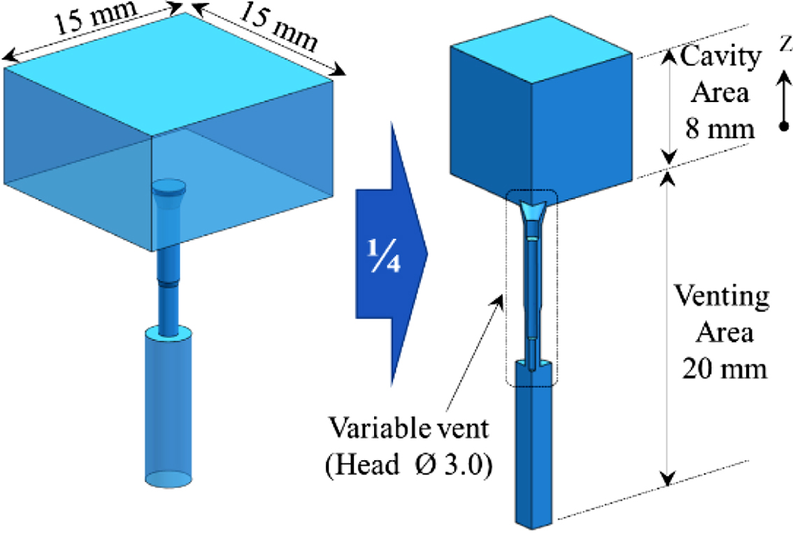 연구모델. 연구모델은 Figure 1과 같이 사각형상을 갖는 캐비티와 캐비티 아래에 벤팅을 위한 홀을 갖고 있는 형상이다. 형상의 대칭성을 고려하여 1/4영역을 해석에 사용하였다. 벤팅 홀을 갖는 벤팅 영역 내에서는 수직방향(Z방향)으로 움직일 수 있는 가변벤트