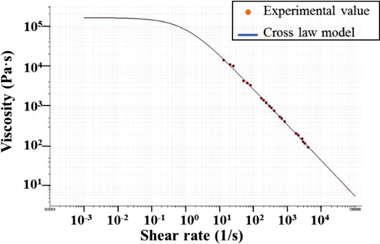(7)과 같이 표현되는 Cross law model을 사용하였으며 curve fitting 결과가 Figure 2에 나타나 있다.